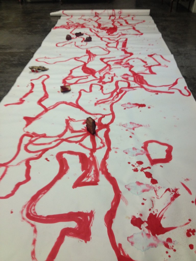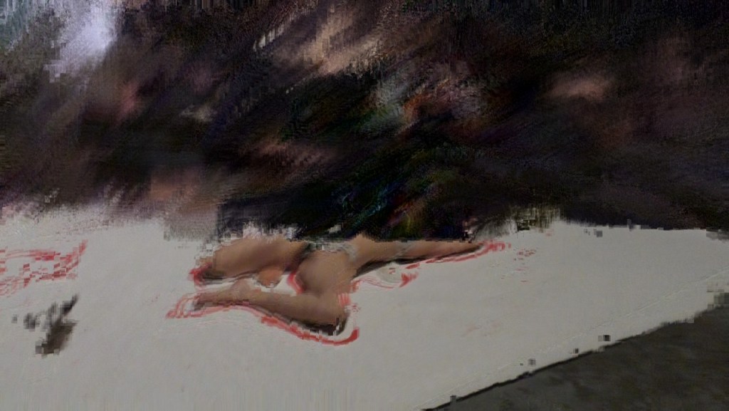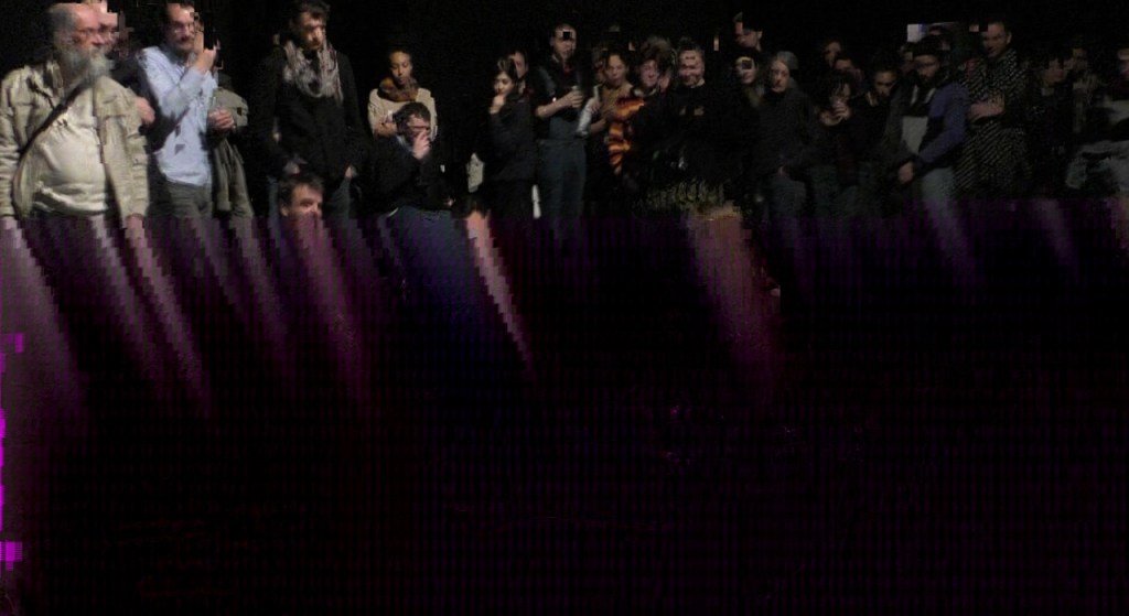 Je peins le contour de leur corps. Lorsque je me tourne et me dirige vers une autre, mes complices poursuivent leurs mouvements, je poursuis le détourage de leurs gestes qui se posent, mes chaussures ont un embout en tissu, le talon est imbibé d’encre. Le public suit mes gestes, le public se répand, coule autour de nous. Déroulé de 11 m, durée de 40 min. Par la suite, le photographe invité à suivre la scène a refusé de partager les images, j’ai donc capturé des images de la video (réalisée par le Générateur) pour les virer en une série Glitch. C’est une scène qui ne saurait être regardé autrement qu’à ce moment-là.