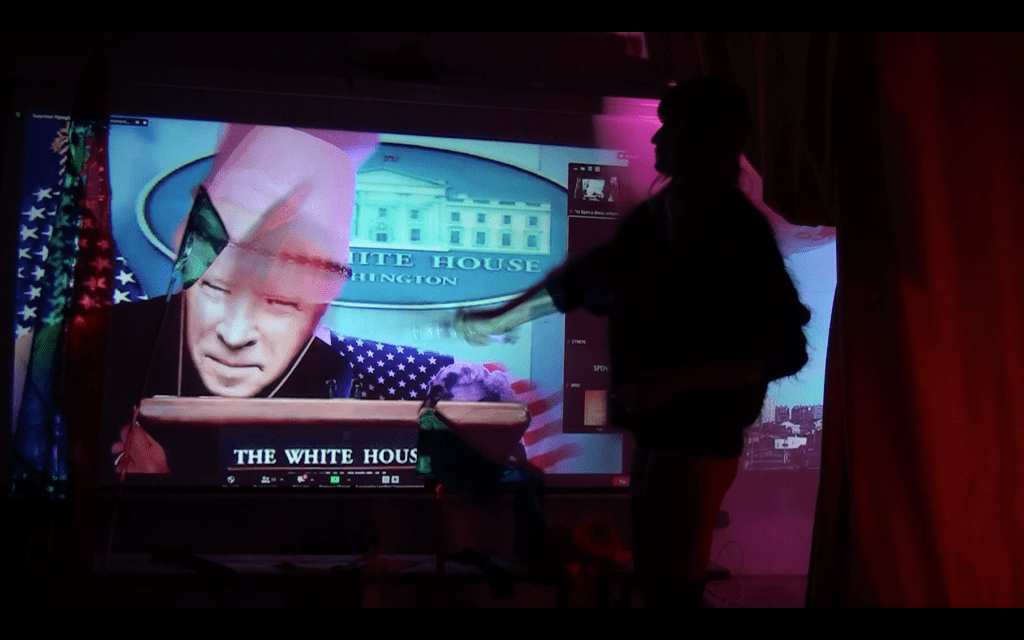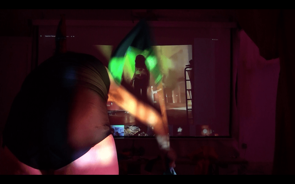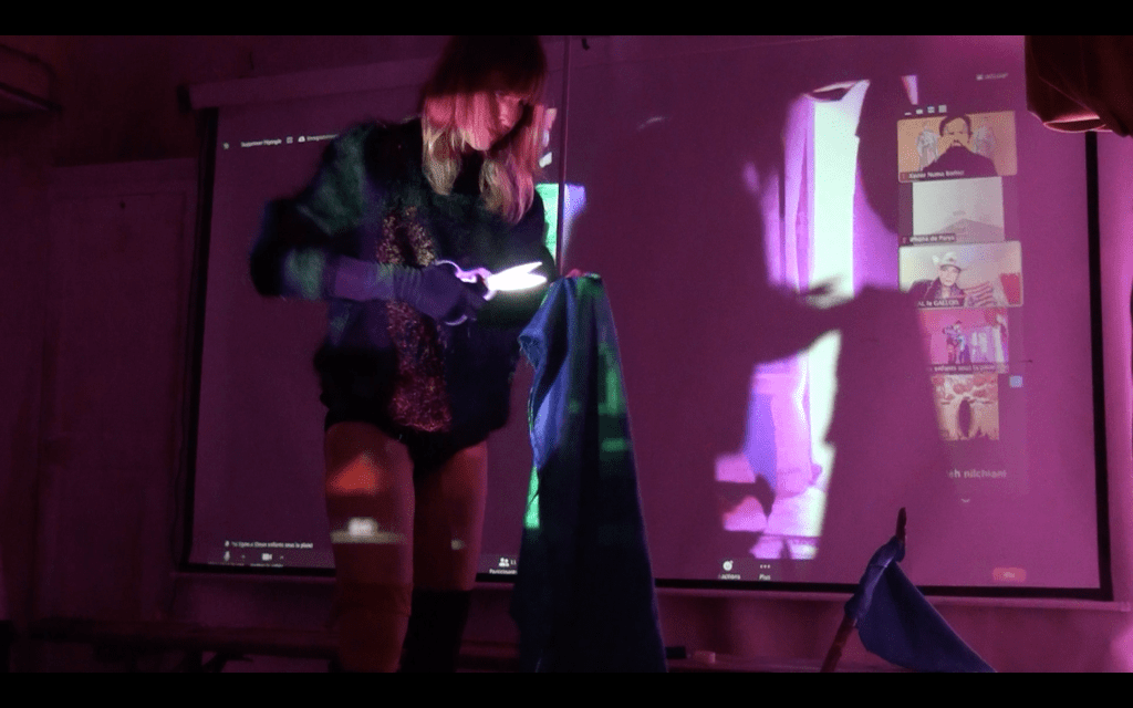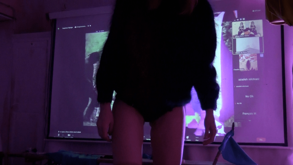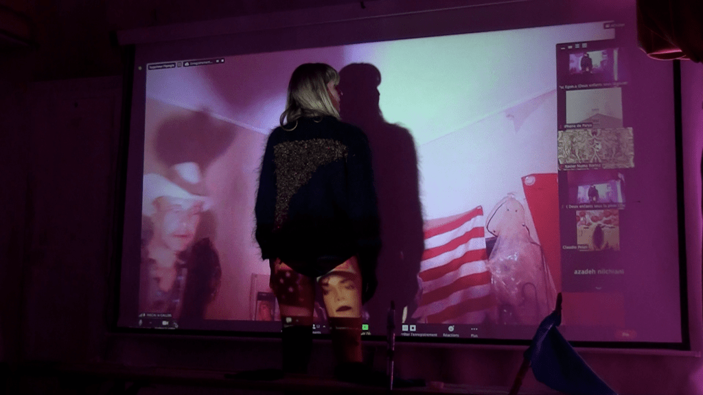Le Coming in — Coming out • j’accueille avec XN Borloz les personnes souhaitant entrer dans le Zoom : Intel.le Admettre ◊ OK/NO. et je fais entrer dans mon espace les différentes scènes des complices en retro-projection. Je reçois dans la seconde pièce Mattéo Vergnes qui performe en direct à côté.