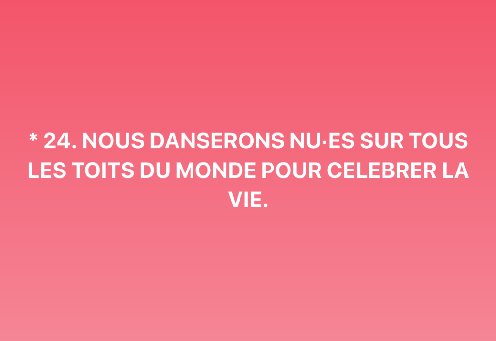 * 24. NOUS DANSERONS NU·ES SUR TOUS LES TOITS DU MONDE POUR CELEBRER LA VIE. sc 2 janvier 2024 par sarah cassentiNon classé Similaire Laisser un commentaireSupprimer la réponse Δ