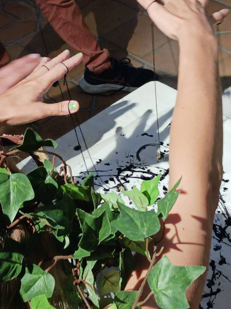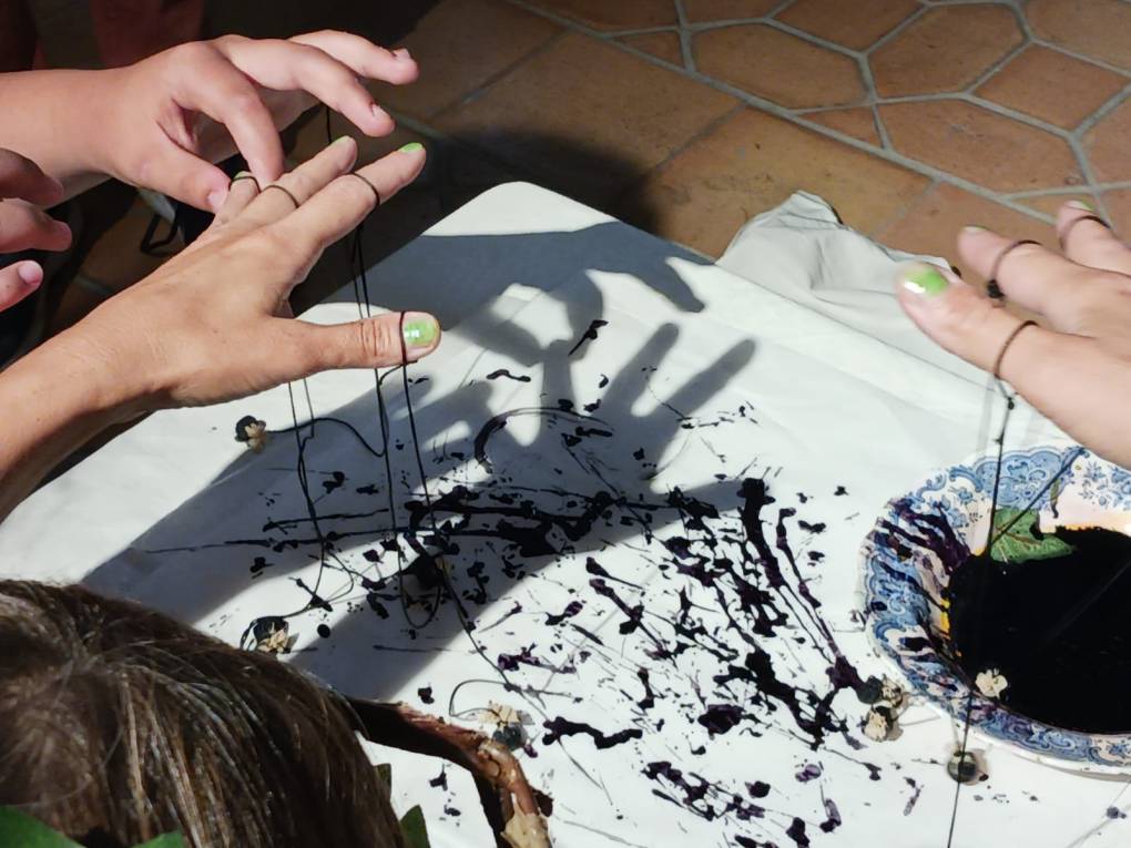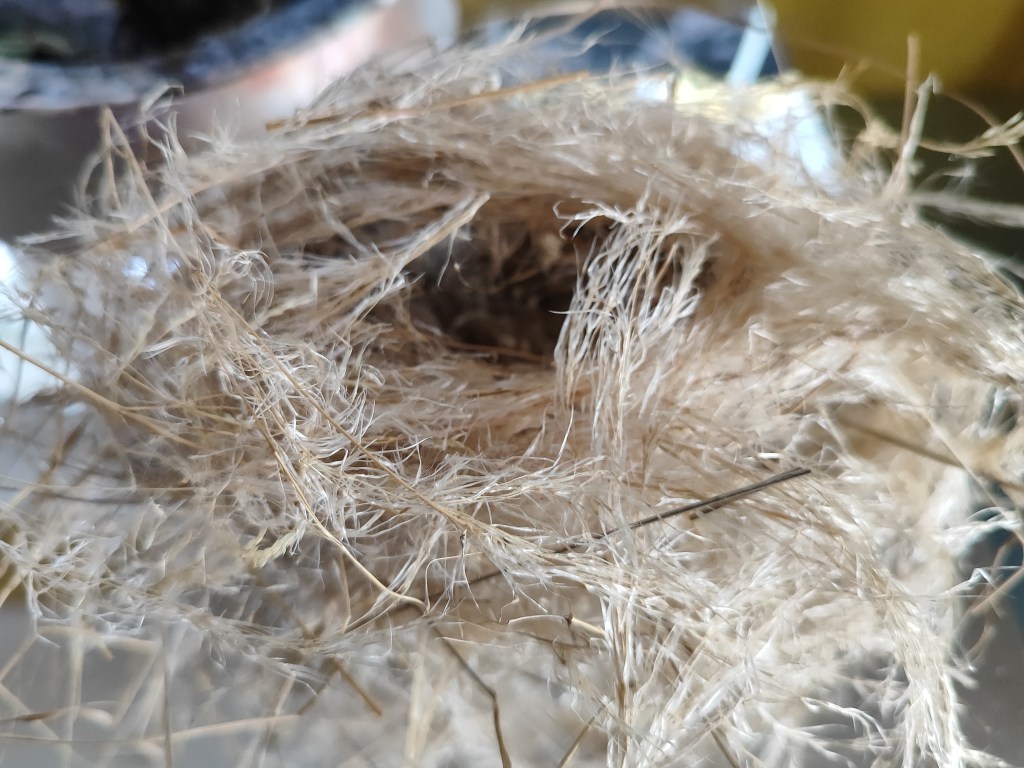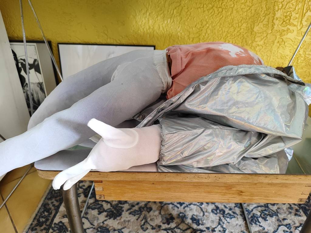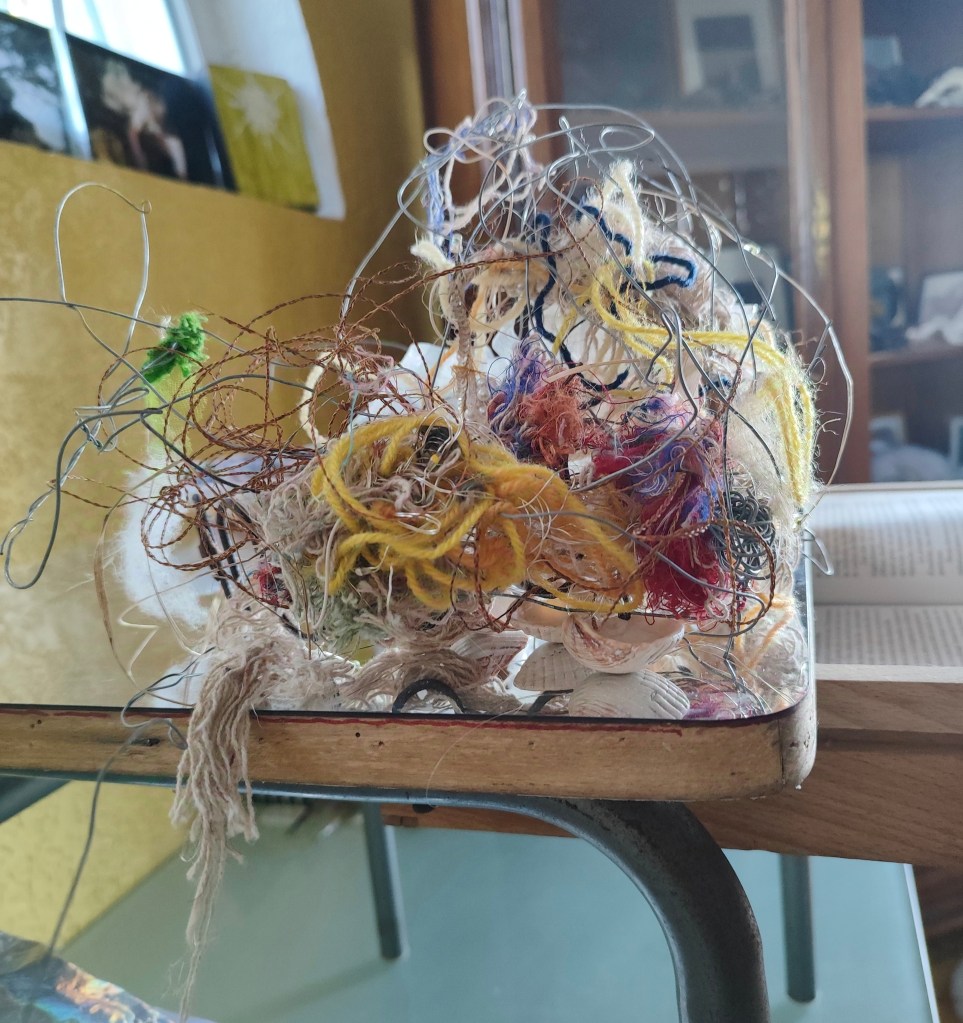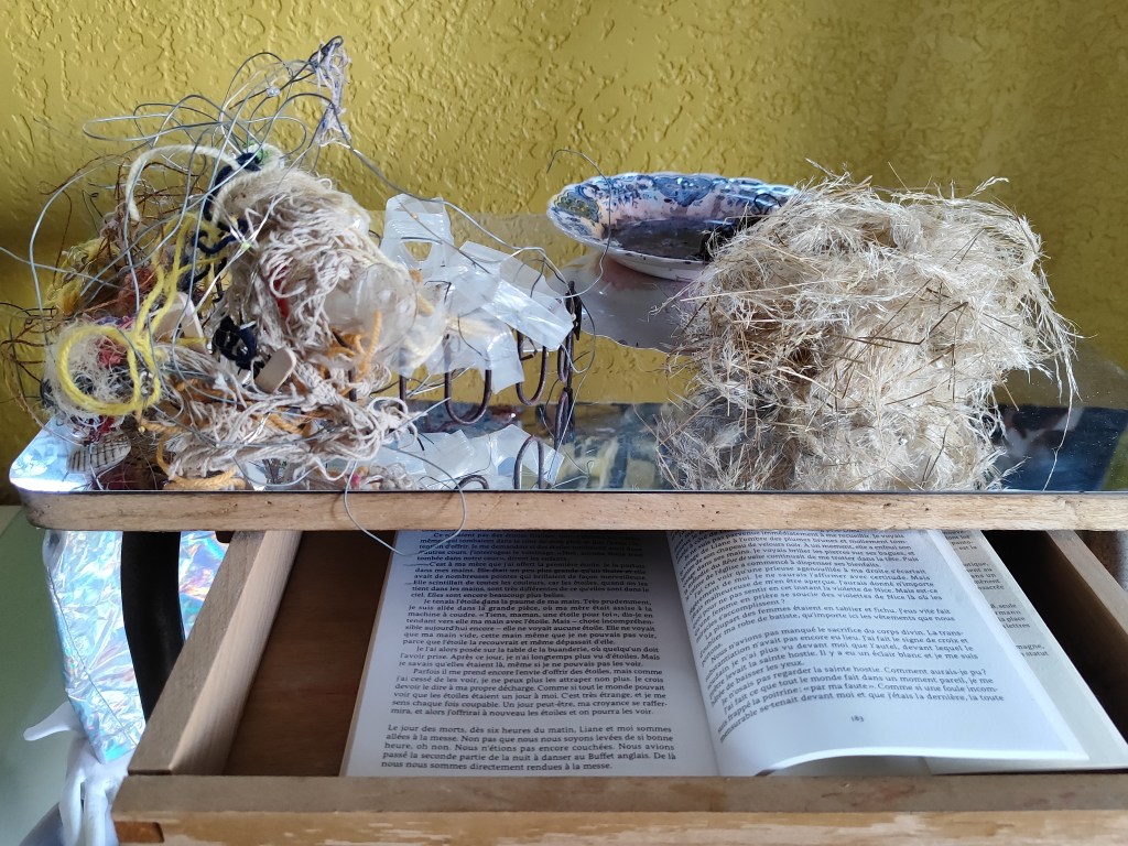 Finesses, nid trouvé le matin de la mort de mon père à La Ciotat, couronne, livre de Emmy Hennings, corps poupée enfant, manteau brillant trouvé par Marie B., assiette encre noire, boulettes comètes, table à tiroir d’écolier couverte en mirolège