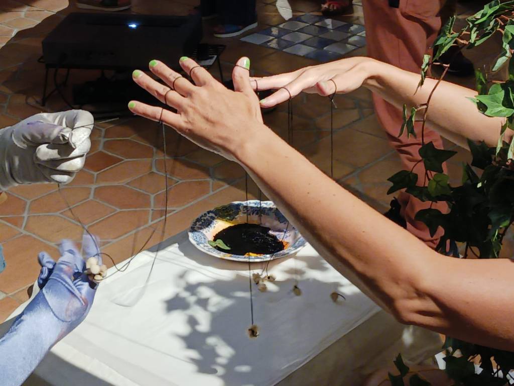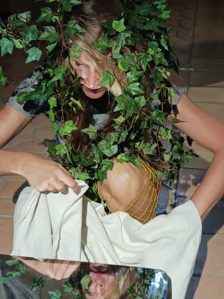 Regard de Mu Fang, La Chapelle des Pénitents bleus, jeudi 20 juin 2024, La Ciotat. “ Comète pour un Solstice « . Performance / bodyart, durée 45min, lors du vernissage de l’exposition Sirènes. Avec Hina et sc.