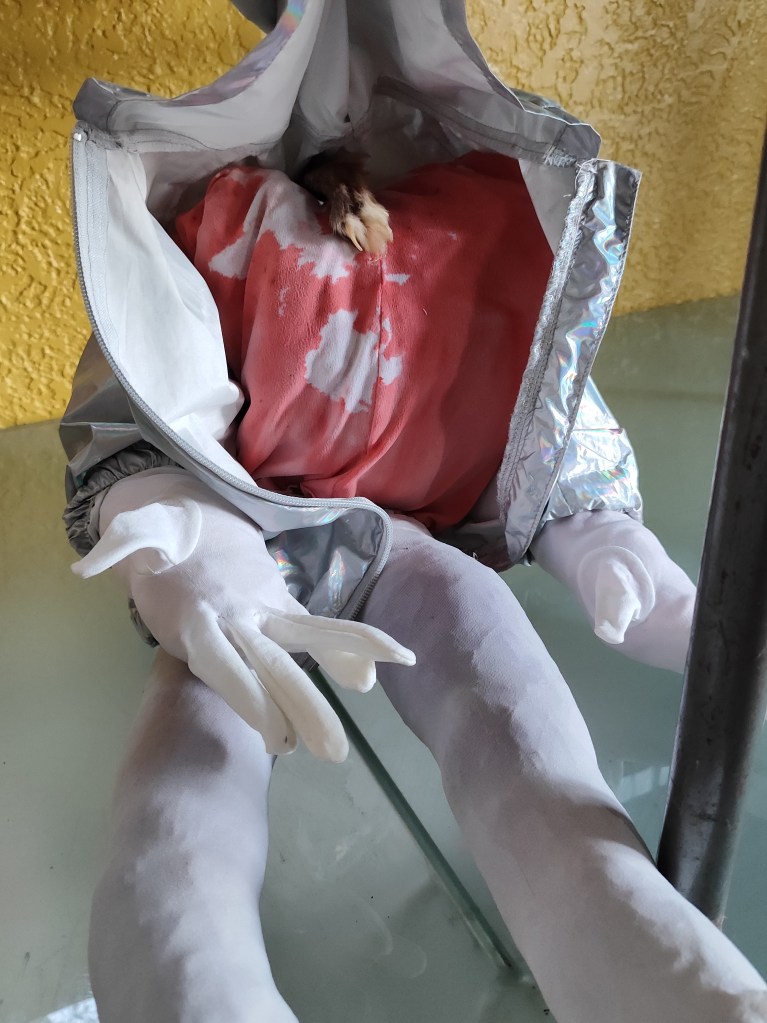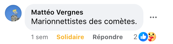 Disséminée dans l’espace de la Chapelle des Pénitents bleus, durant le temps de l’exposition l’installation se constitue des objets et des accessoires marquant le passage de la comète, en souvenir de la performance.