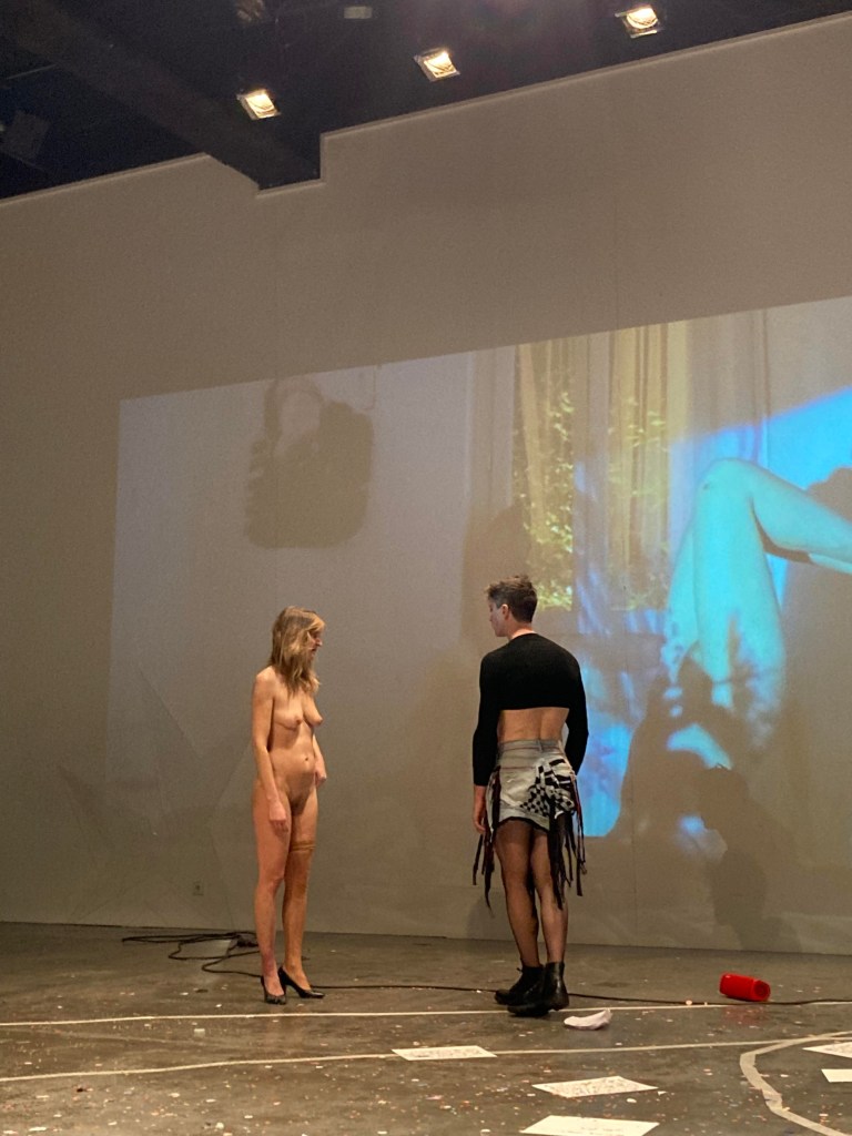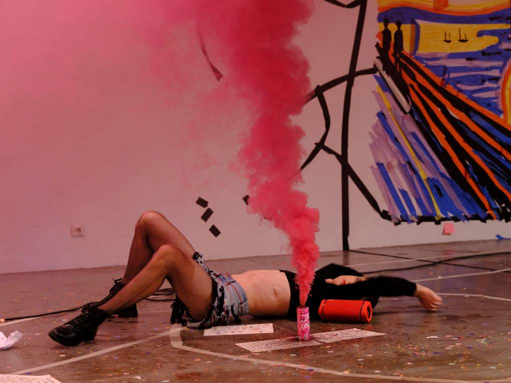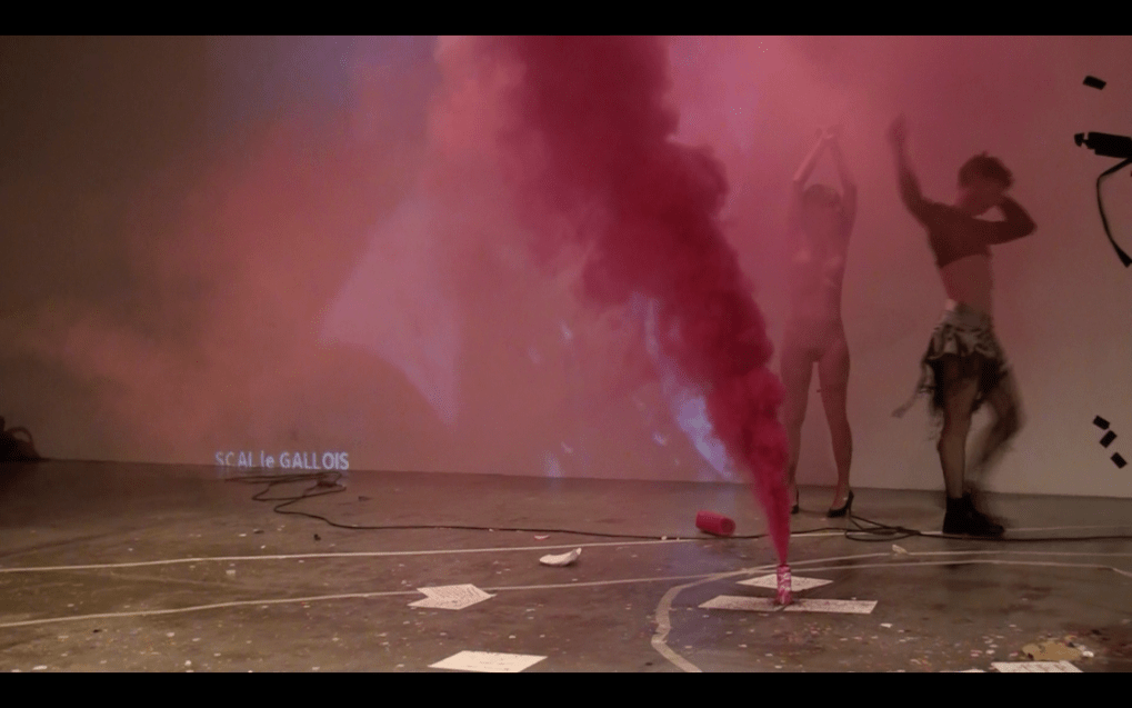J’édite une nouvelle scène-vivante (mon expression ne passe pas par la performance, je ne peux répondre de la manière souhaitée au sujet proposé), J’imagine des scènes-vivantes avec mes complices depuis 2009 ou des Nö-actions depuis 2002 via les idiotes, ensemble avec Hélène Defilippi. Nous travaillons par le vivant, par le singulier, avec le contexte et la réalité qui nous traversent à ce moment-là. Lors de la manifestation PS, je réédite simplement le process, celui qui est à l’œuvre lors de mes scènes-vivantes. Ici, je prolonge le destin de Bodygirl, je pars d’un dessin réalisé tantôt, j’invite et j’entoure les gestes de JaneB, être magnétique, première au Générateur pour iel et prêt à mouvementer ce temps-là avec moi. Dix minutes ne me suffisent pas, alors je choisis que les temps se superposent, deux scènes-vivantes se déroulent en accord et en simultané, les pistes sons se superposent ainsi que les temps capturés dans la vidéo de différentes scènes et de différentes pistes sonores.