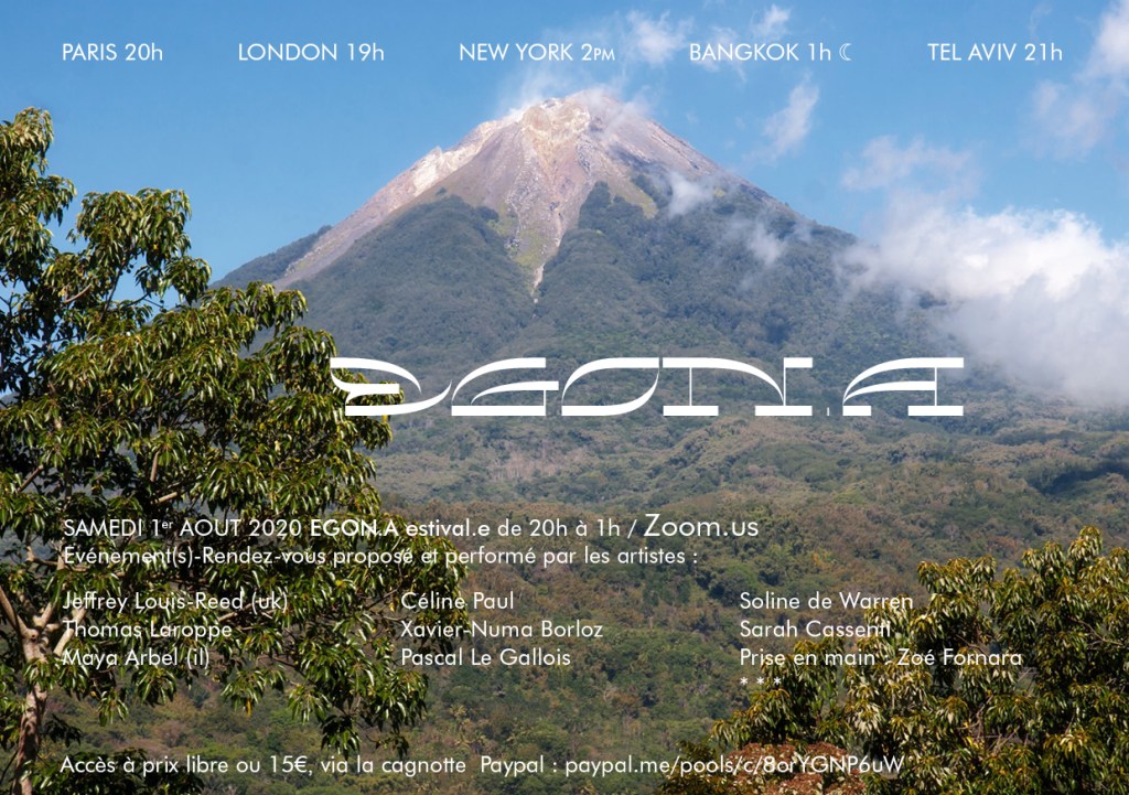 Le corps et le geste de l’artiste sont sacrés. Nous infiltrons le souffle de no.s.tre corps Libre.s sur le web. Egon c’est un volcan en Indonésie et c’est un peintre du corps à vif, le .a ouvre à la féminité infinie – la question du corps, corps intérieur qui passe devant, qui déborde en douceur. Ces nuits-là, l’espace-temps Egon.a s’étend. Nous nous rejoignons pour émettre depuis le volcan. sc