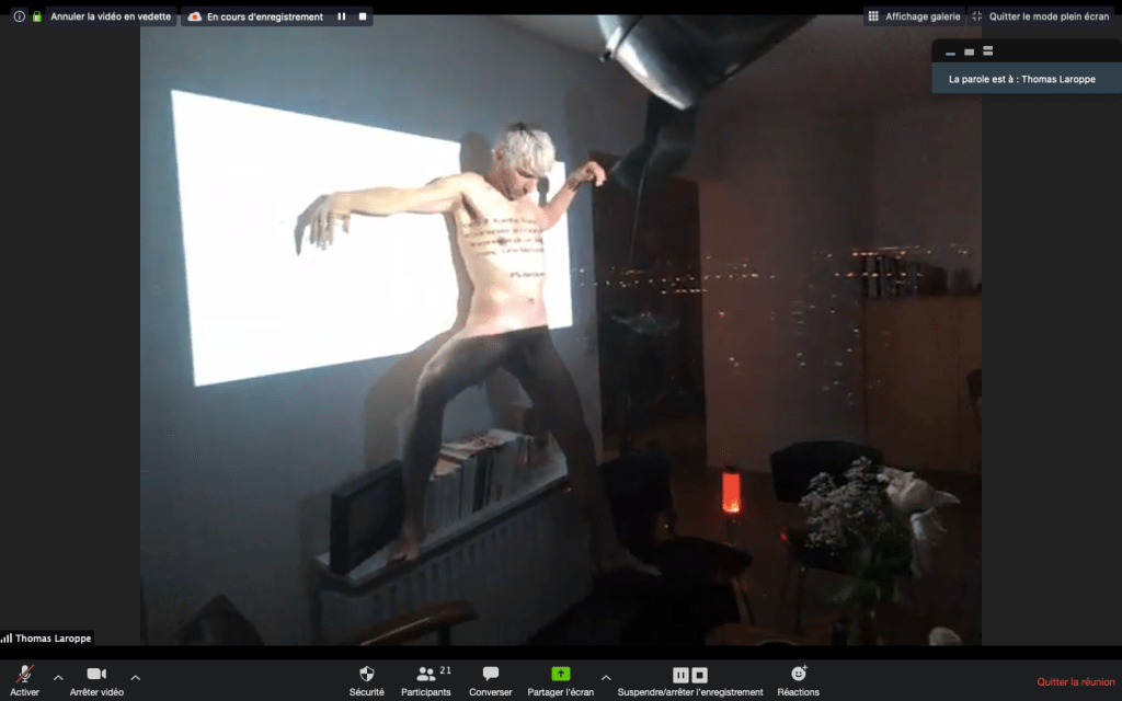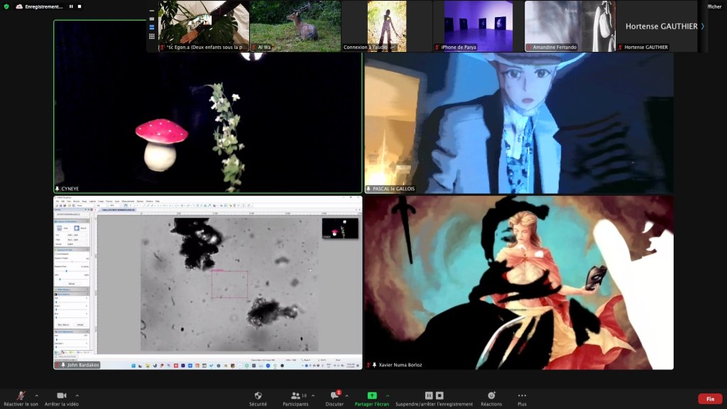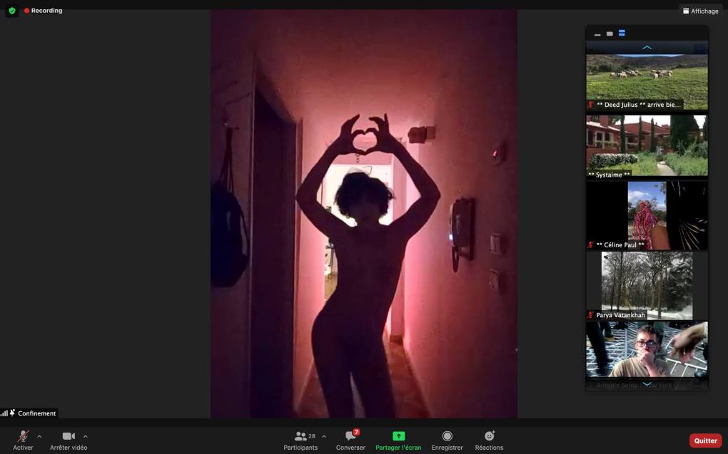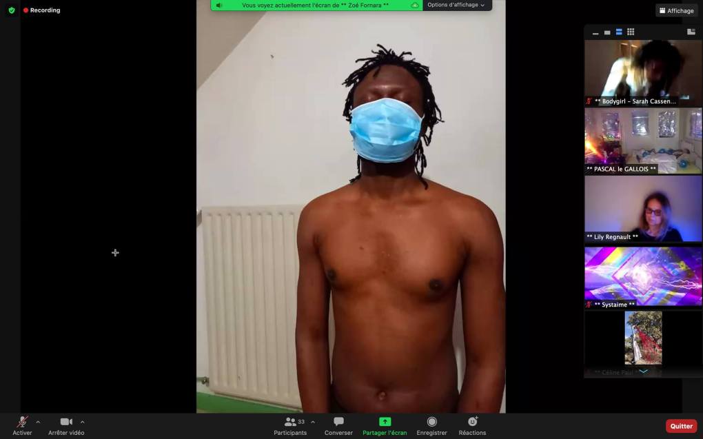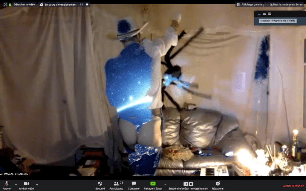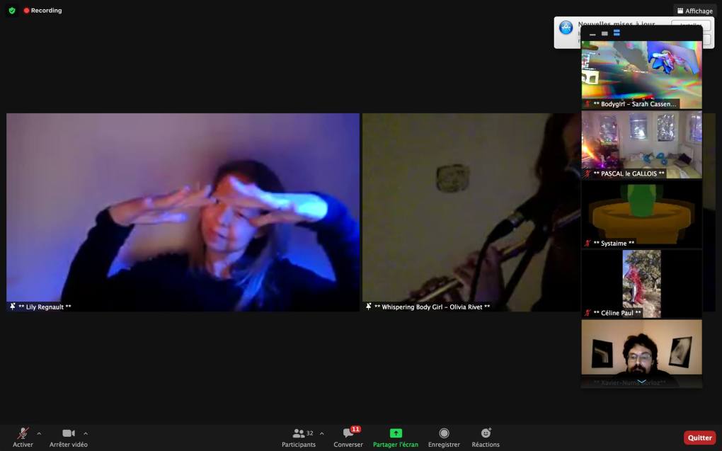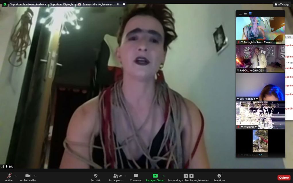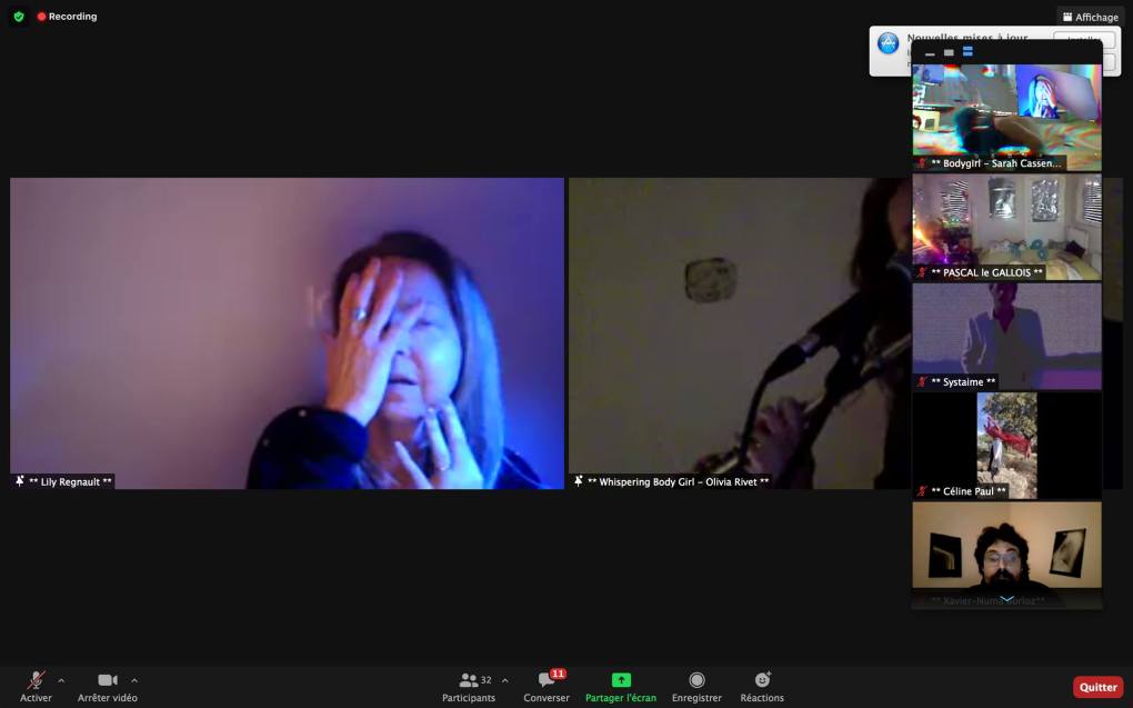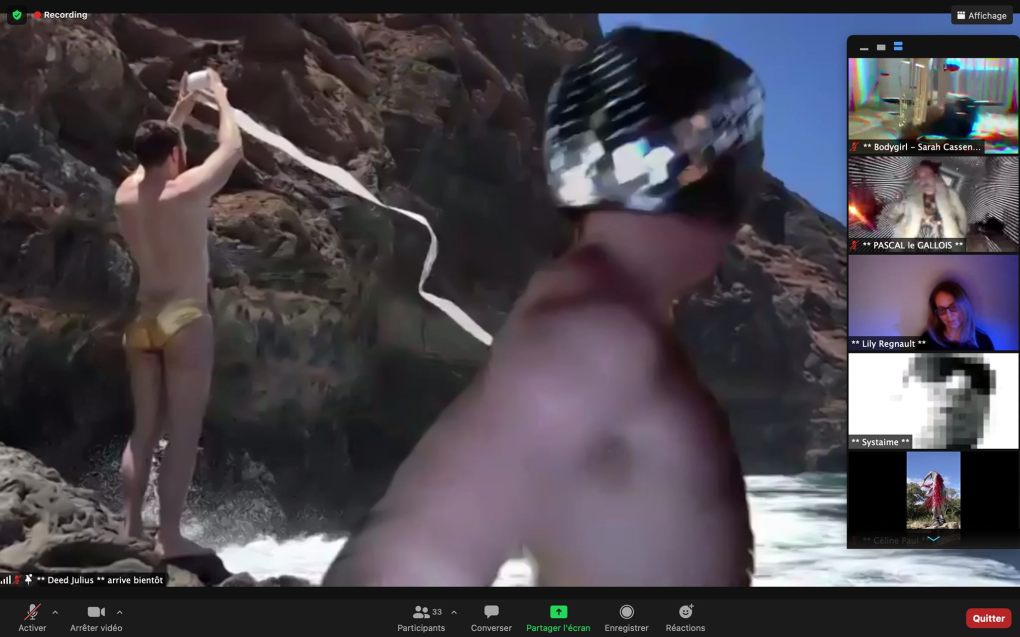Evénement-Rendez-vous proposé par Sarah Cassenti et performé par les artistes : Anna Ten – Sarah Cassenti (première apparition de Bodygirl) – Parya Vatankhah, Xavier Numa Borloz – Thomas Laroppe – Fred Munoz – Maya Arbel – Jeffrey Louis Reed – Pascal le Gallois – David Coignard – Soline de Warren – Antonio et Peggy Tan. Accueil et Pilotage Zoom : Zoé Fornara