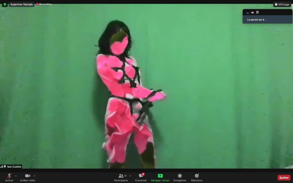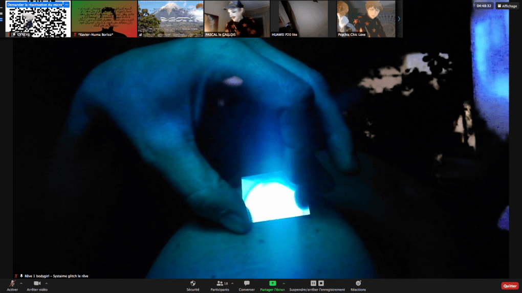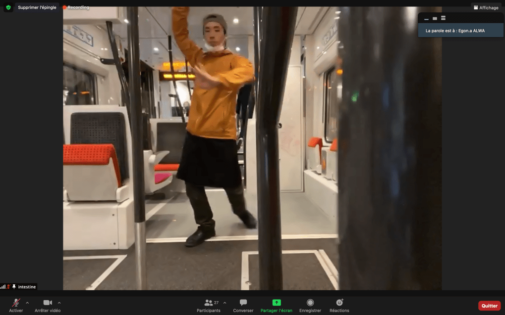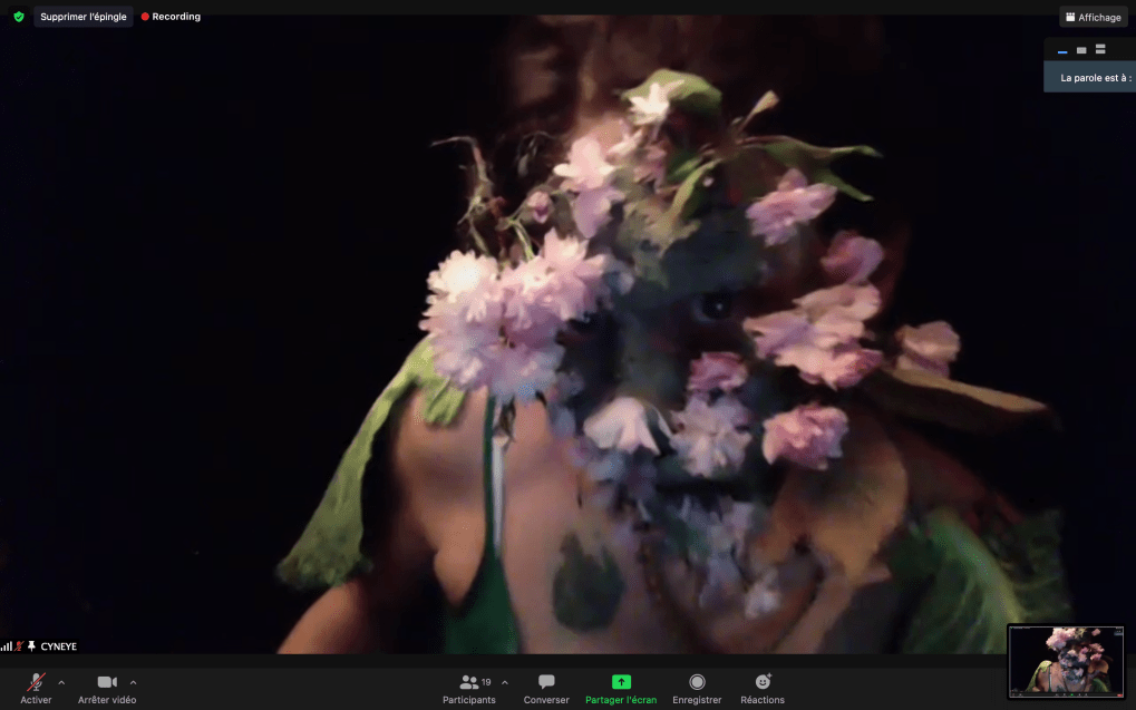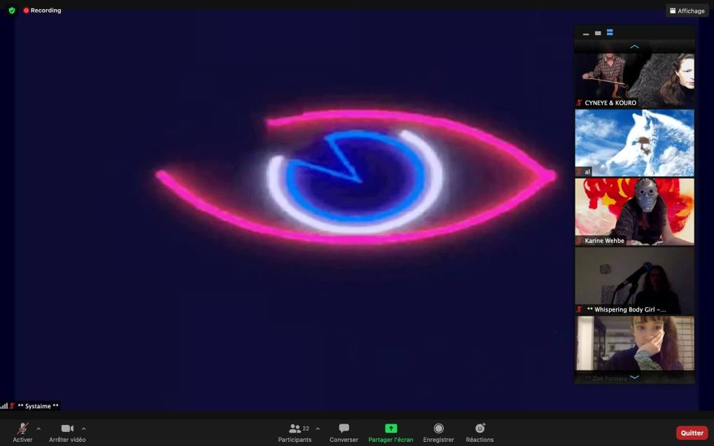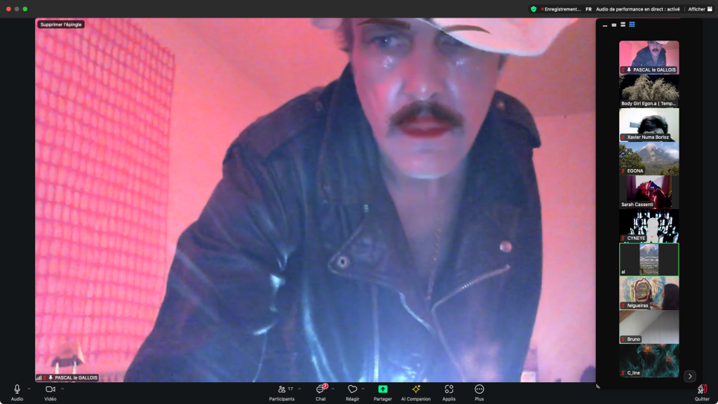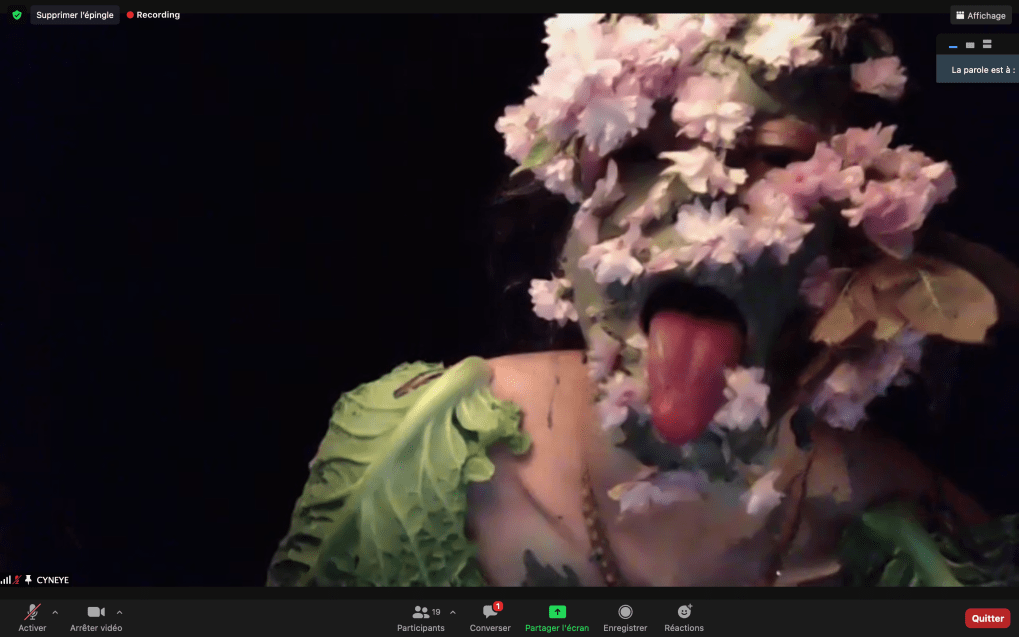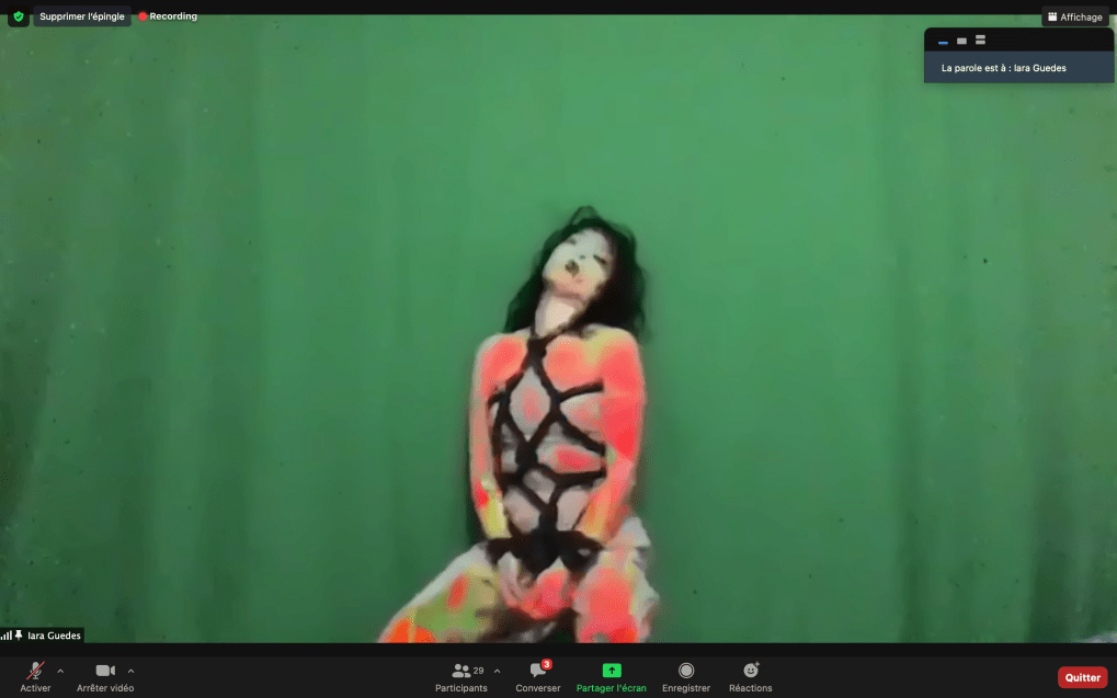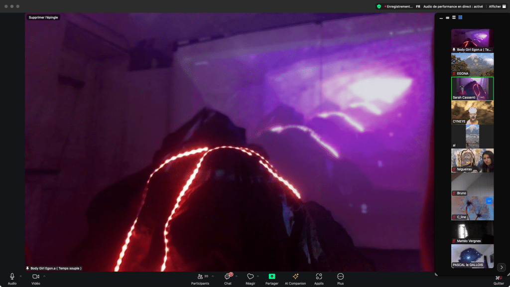 Evénement-Rendez-vous proposé par Sarah Cassenti et performé par les artistes : Anna Ten – Sarah Cassenti (première apparition de Bodygirl) – Parya Vatankhah, Xavier Numa Borloz – Thomas Laroppe – Fred Munoz – Maya Arbel – Jeffrey Louis Reed – Pascal le Gallois – David Coignard – Soline de Warren – Antonio et Peggy Tan. Accueil et Pilotage Zoom : Zoé Fornara