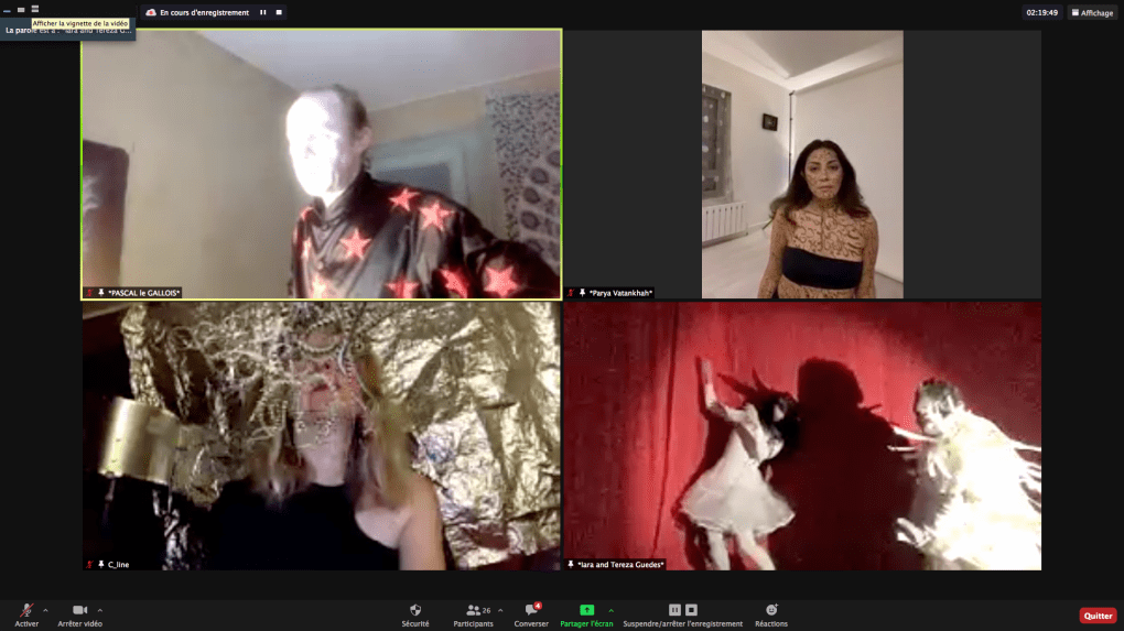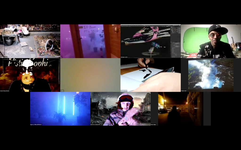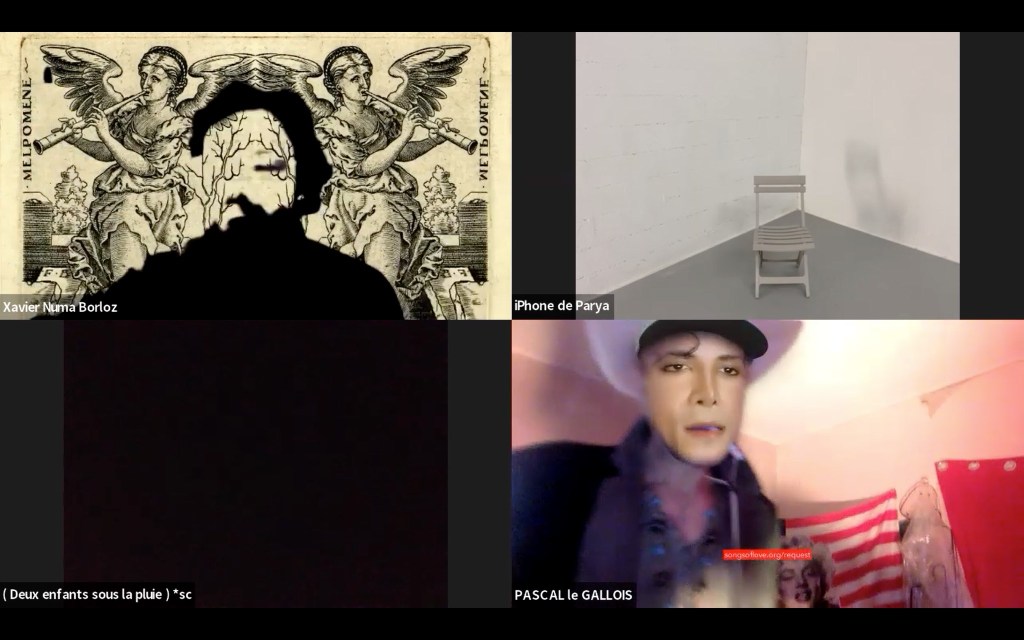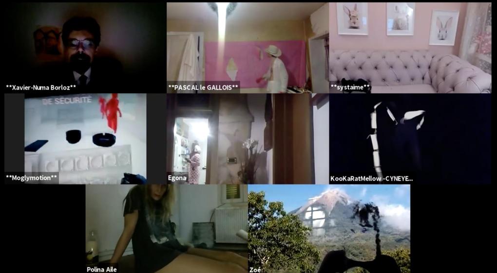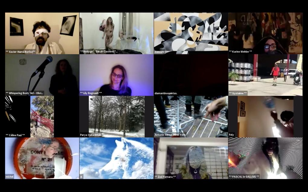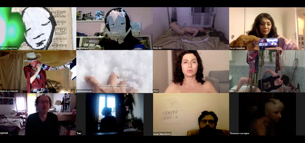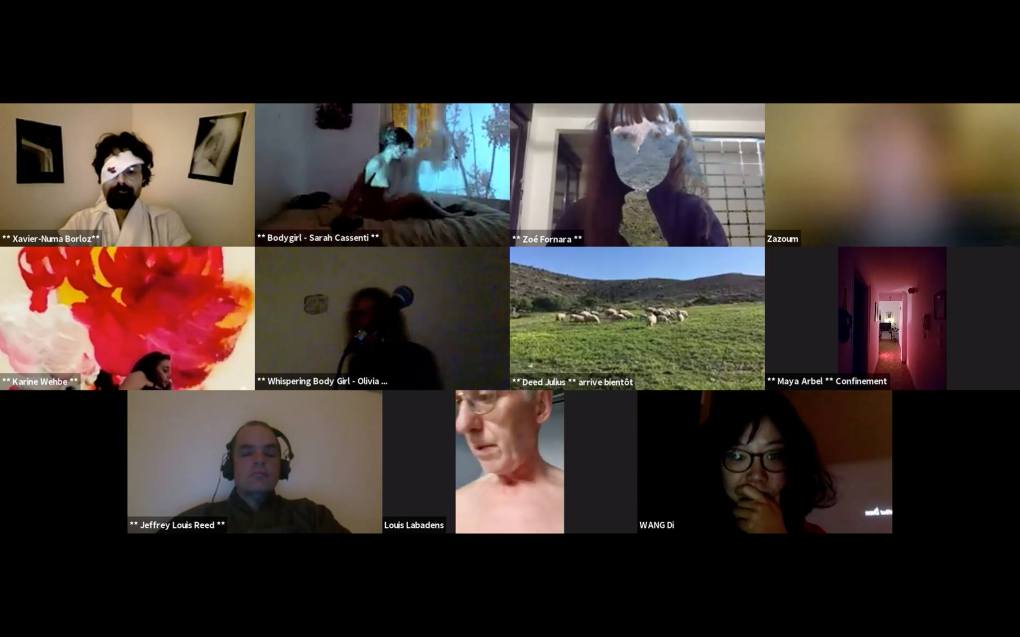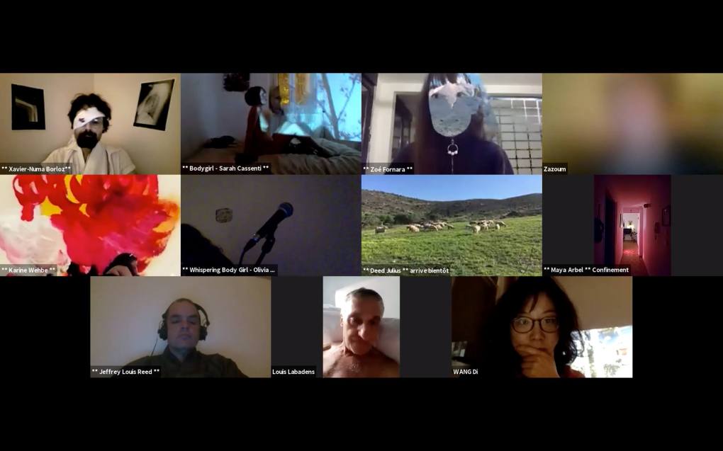 Evénement online performé et programmé par les artistes et dramaturges, imaginé par Sarah Cassenti, accueil et pilotage zoom, Zoé Fornara • Pascal le Gallois (Nantes) – Michaël Systaime Borras (Limoges) – Chris Korda (Californie) interviewé par Alexandre Breton (Paris) – Iara Guedes (Brésil) – Xavier Numa Borloz (Sèvres) – Olivia Rivet (La Ciotat) – Lily Regnault (La Ciotat) – AB Khamilabsu (Belgique) (excusé) – Smile Intestine (Jp – Fr) – Michel Lascault (Metz) – Celine Paul (Nîmes) – Mbuyi Tickson (Kinshasa – La Ciotat) – Deed Julius (Paris) – Cyneye (Ivry) – Mogly Speix (Bagnolet) – Marie Molins (Paris) – Parya Vatankhah (Iran-France) – Lyonel Kouro (Paris) – Thomas Laroppe (La Ciotat) – Jeffrey Louis Reed (Hastings uk) – Aurélia Jaubert (Joucas) – Cédric Lerible (Toulon) – Wang Di (Chine) – Sarah Cassenti (La Ciotat) – Jakob Liu Wächter – de Zordo (Paris-Vienne) (excusé) – Antonio Serna (New-York)