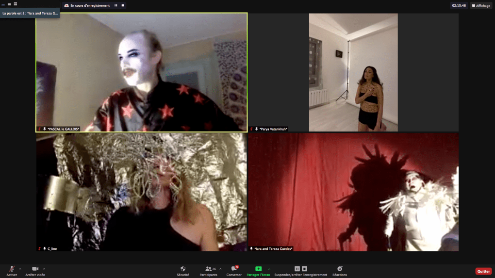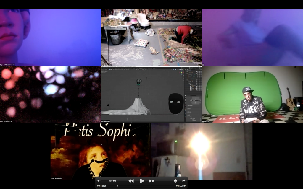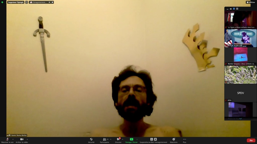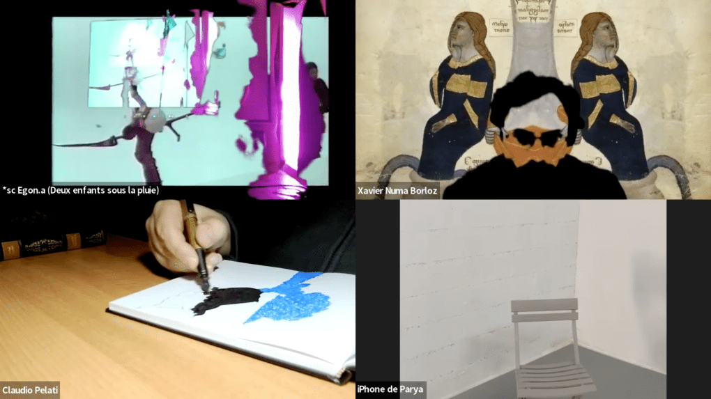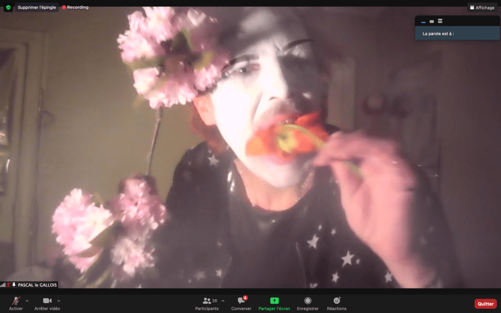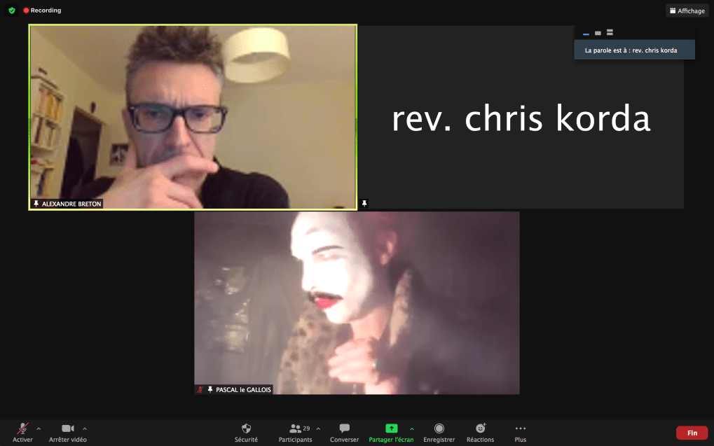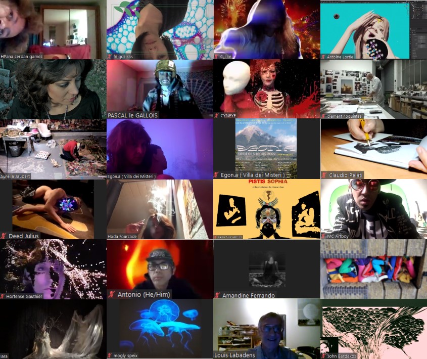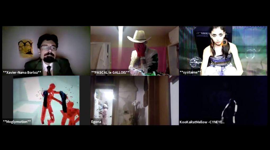 Evénement online performé et programmé par les artistes et dramaturges, imaginé par Sarah Cassenti, accueil et pilotage zoom, Zoé Fornara • Pascal le Gallois (Nantes) – Michaël Systaime Borras (Limoges) – Chris Korda (Californie) interviewé par Alexandre Breton (Paris) – Iara Guedes (Brésil) – Xavier Numa Borloz (Sèvres) – Olivia Rivet (La Ciotat) – Lily Regnault (La Ciotat) – AB Khamilabsu (Belgique) (excusé) – Smile Intestine (Jp – Fr) – Michel Lascault (Metz) – Celine Paul (Nîmes) – Mbuyi Tickson (Kinshasa – La Ciotat) – Deed Julius (Paris) – Cyneye (Ivry) – Mogly Speix (Bagnolet) – Marie Molins (Paris) – Parya Vatankhah (Iran-France) – Lyonel Kouro (Paris) – Thomas Laroppe (La Ciotat) – Jeffrey Louis Reed (Hastings uk) – Aurélia Jaubert (Joucas) – Cédric Lerible (Toulon) – Wang Di (Chine) – Sarah Cassenti (La Ciotat) – Jakob Liu Wächter – de Zordo (Paris-Vienne) (excusé) – Antonio Serna (New-York)