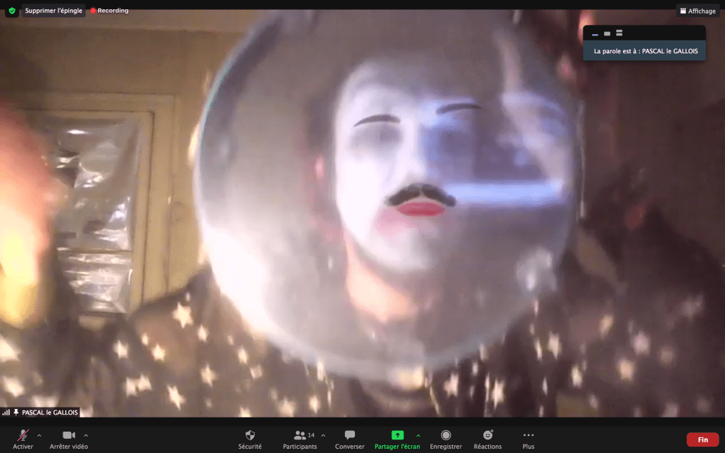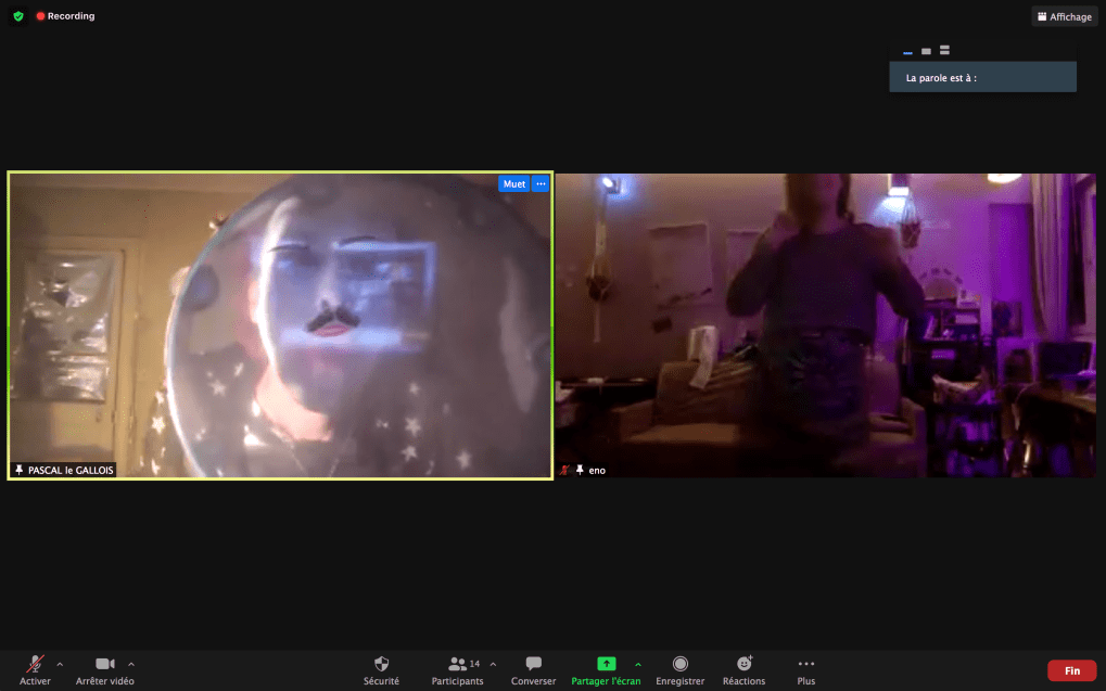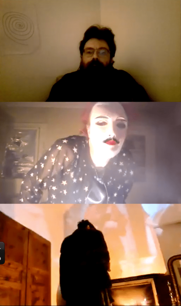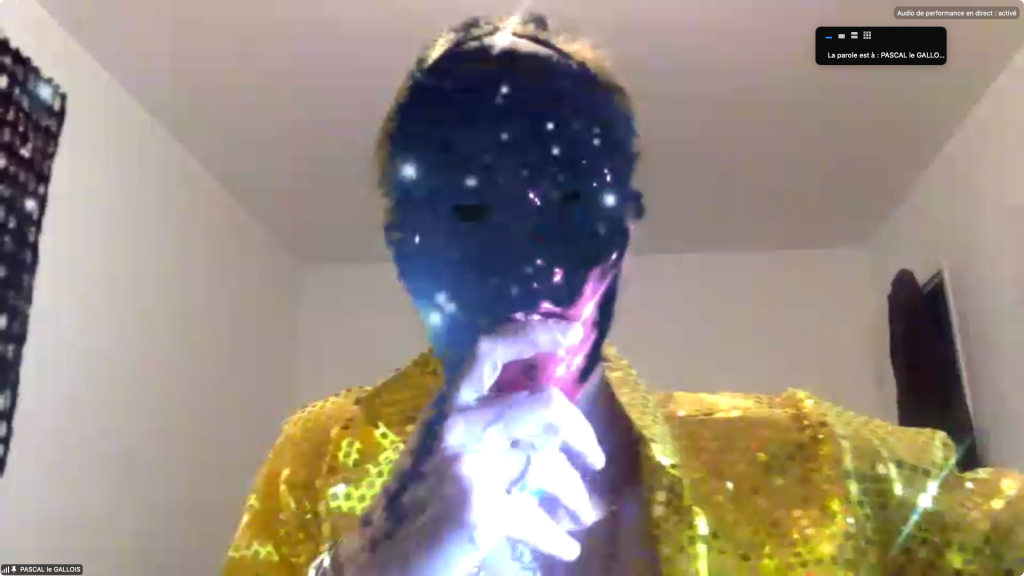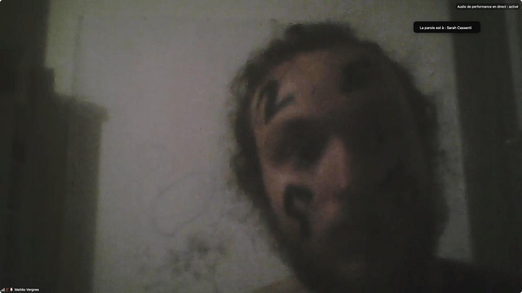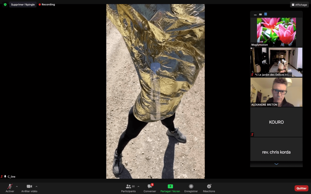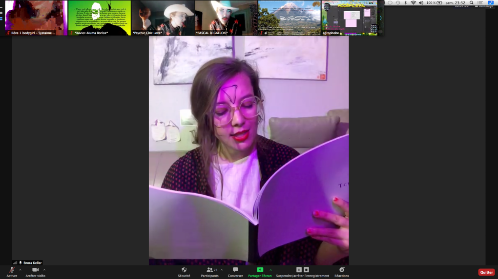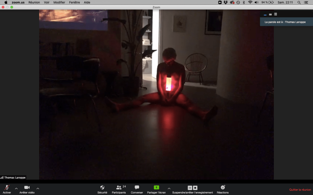 Evénement online performé et programmé par les artistes et dramaturges, imaginé par Sarah Cassenti, accueil et pilotage zoom, Zoé Fornara • Pascal le Gallois (Nantes) – Michaël Systaime Borras (Limoges) – Chris Korda (Californie) interviewé par Alexandre Breton (Paris) – Iara Guedes (Brésil) – Xavier Numa Borloz (Sèvres) – Olivia Rivet (La Ciotat) – Lily Regnault (La Ciotat) – AB Khamilabsu (Belgique) (excusé) – Smile Intestine (Jp – Fr) – Michel Lascault (Metz) – Celine Paul (Nîmes) – Mbuyi Tickson (Kinshasa – La Ciotat) – Deed Julius (Paris) – Cyneye (Ivry) – Mogly Speix (Bagnolet) – Marie Molins (Paris) – Parya Vatankhah (Iran-France) – Lyonel Kouro (Paris) – Thomas Laroppe (La Ciotat) – Jeffrey Louis Reed (Hastings uk) – Aurélia Jaubert (Joucas) – Cédric Lerible (Toulon) – Wang Di (Chine) – Sarah Cassenti (La Ciotat) – Jakob Liu Wächter – de Zordo (Paris-Vienne) (excusé) – Antonio Serna (New-York)