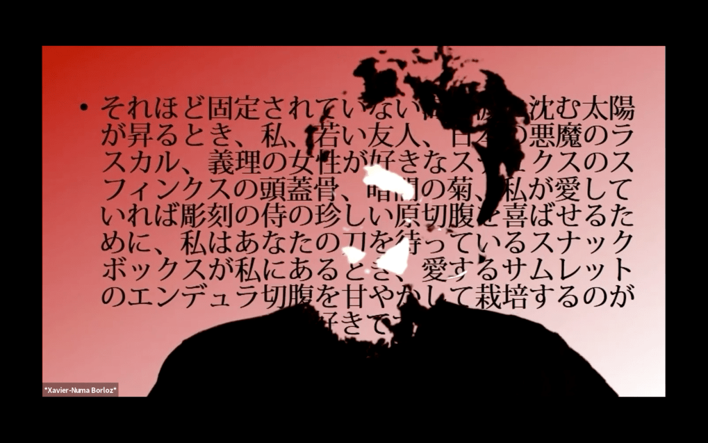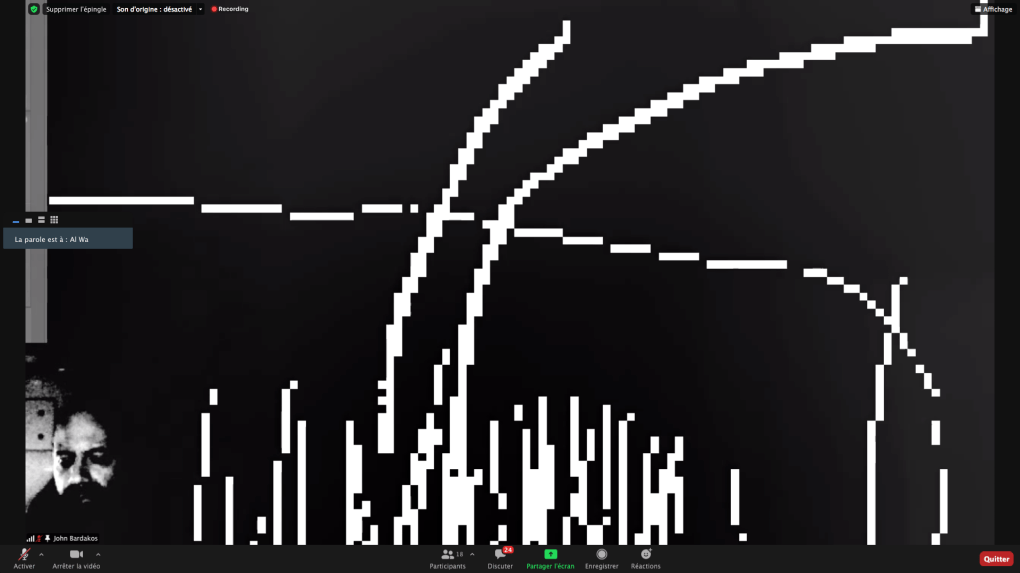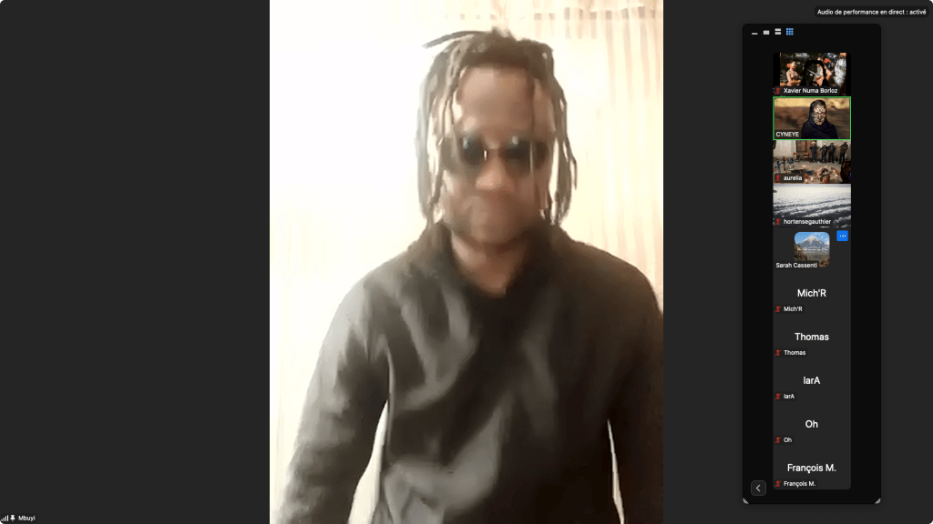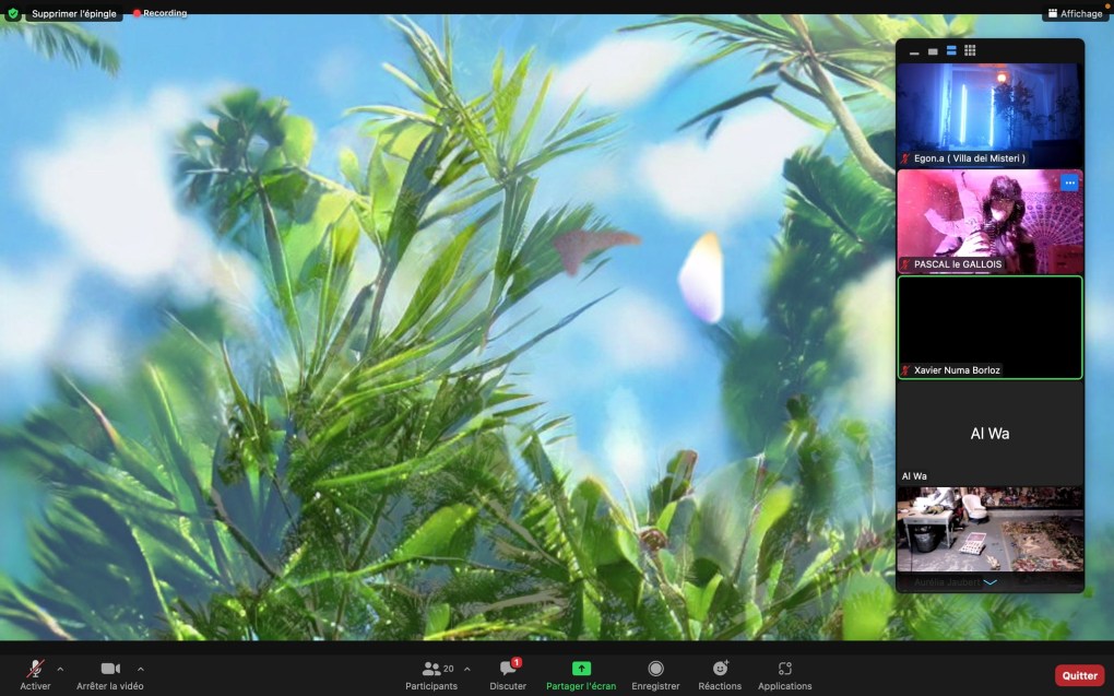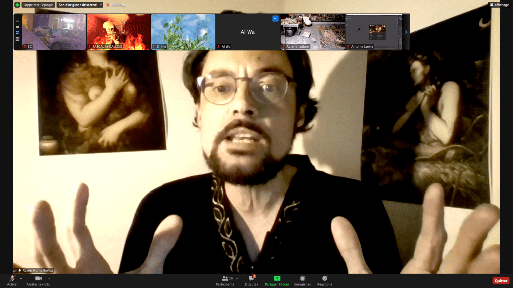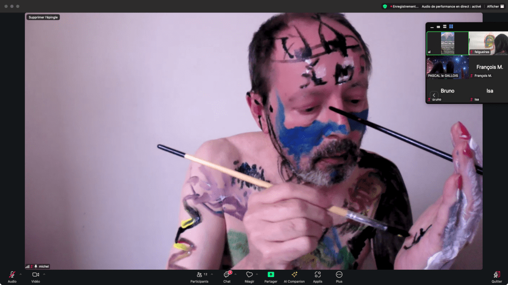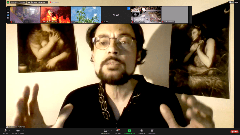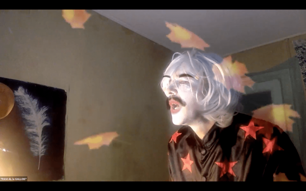 Evénement online performé et programmé par les artistes et dramaturges, imaginé par Sarah Cassenti, accueil et pilotage zoom, Zoé Fornara • Pascal le Gallois (Nantes) – Michaël Systaime Borras (Limoges) – Chris Korda (Californie) interviewé par Alexandre Breton (Paris) – Iara Guedes (Brésil) – Xavier Numa Borloz (Sèvres) – Olivia Rivet (La Ciotat) – Lily Regnault (La Ciotat) – AB Khamilabsu (Belgique) (excusé) – Smile Intestine (Jp – Fr) – Michel Lascault (Metz) – Celine Paul (Nîmes) – Mbuyi Tickson (Kinshasa – La Ciotat) – Deed Julius (Paris) – Cyneye (Ivry) – Mogly Speix (Bagnolet) – Marie Molins (Paris) – Parya Vatankhah (Iran-France) – Lyonel Kouro (Paris) – Thomas Laroppe (La Ciotat) – Jeffrey Louis Reed (Hastings uk) – Aurélia Jaubert (Joucas) – Cédric Lerible (Toulon) – Wang Di (Chine) – Sarah Cassenti (La Ciotat) – Jakob Liu Wächter – de Zordo (Paris-Vienne) (excusé) – Antonio Serna (New-York)