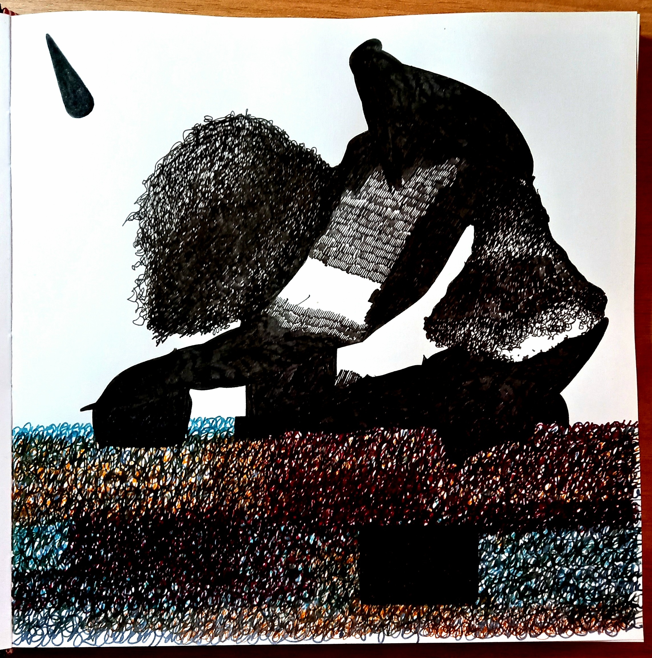 Temps distendu, carnaval et son dédoublement du corps et du temps, temps libre, fugace. Léger·es, nous sommes épargné·es de tout, nous nous lovons au cœur de ce temps qui nous reçoit et se déforme avec nous, qui ne coule plus de haut en bas mais qui s’étend, s’étire souplement sur une surface plane, la ligne de l’horizon n’est plus. Lorsque le temps devient souple, il se crée sa zone de durée propre où sont amalgamés les autres couches de temps, les souvenirs, le présent et les futurs en cours, pour calmer leur agitation, pour pouvoir nous retrouver dans l’intimité de ce qui nous traverse.