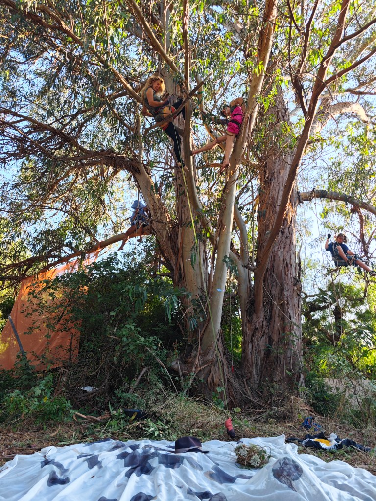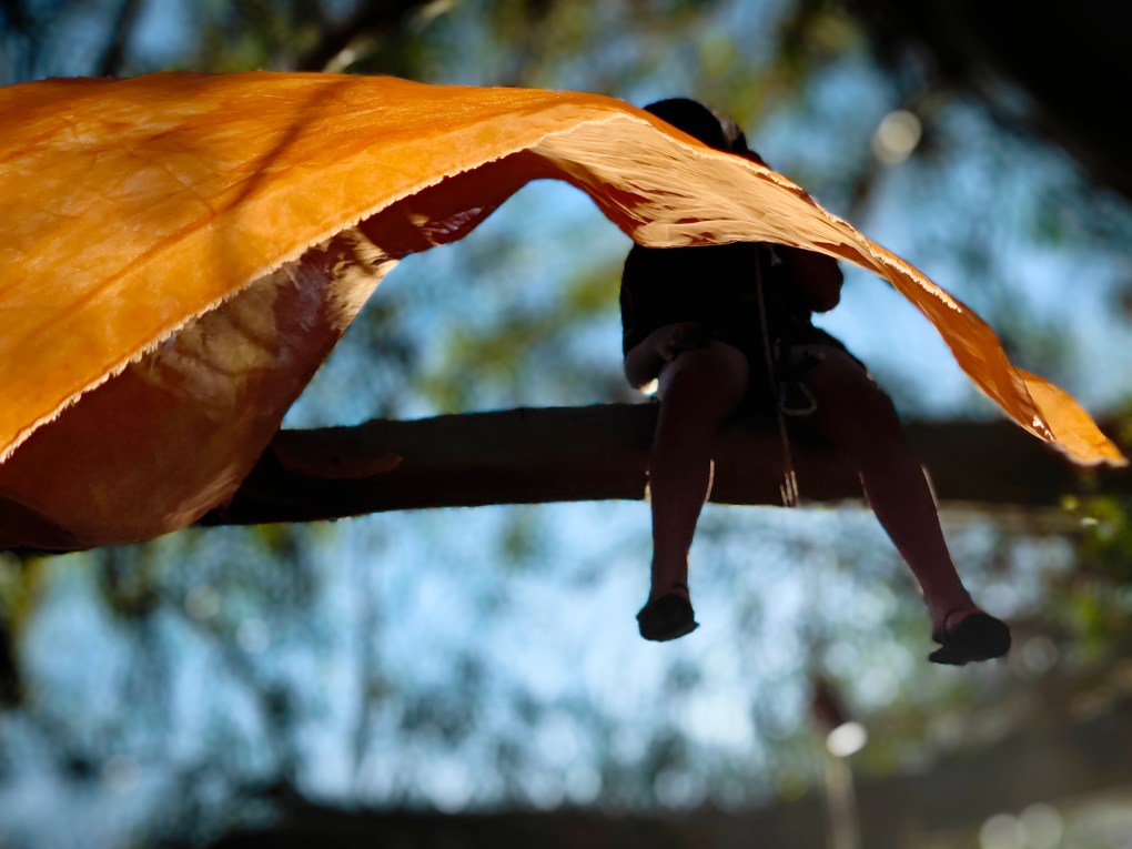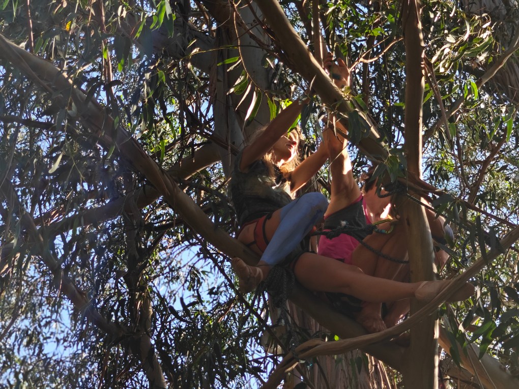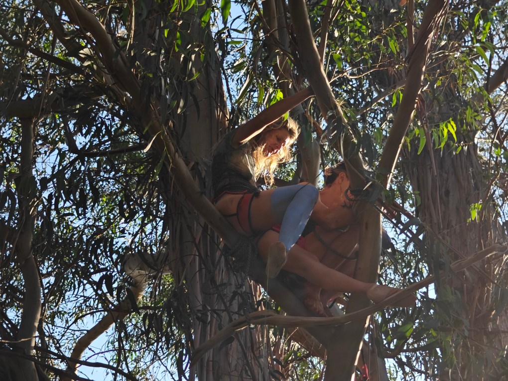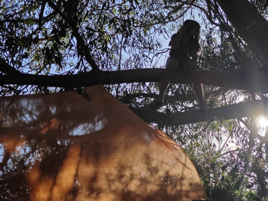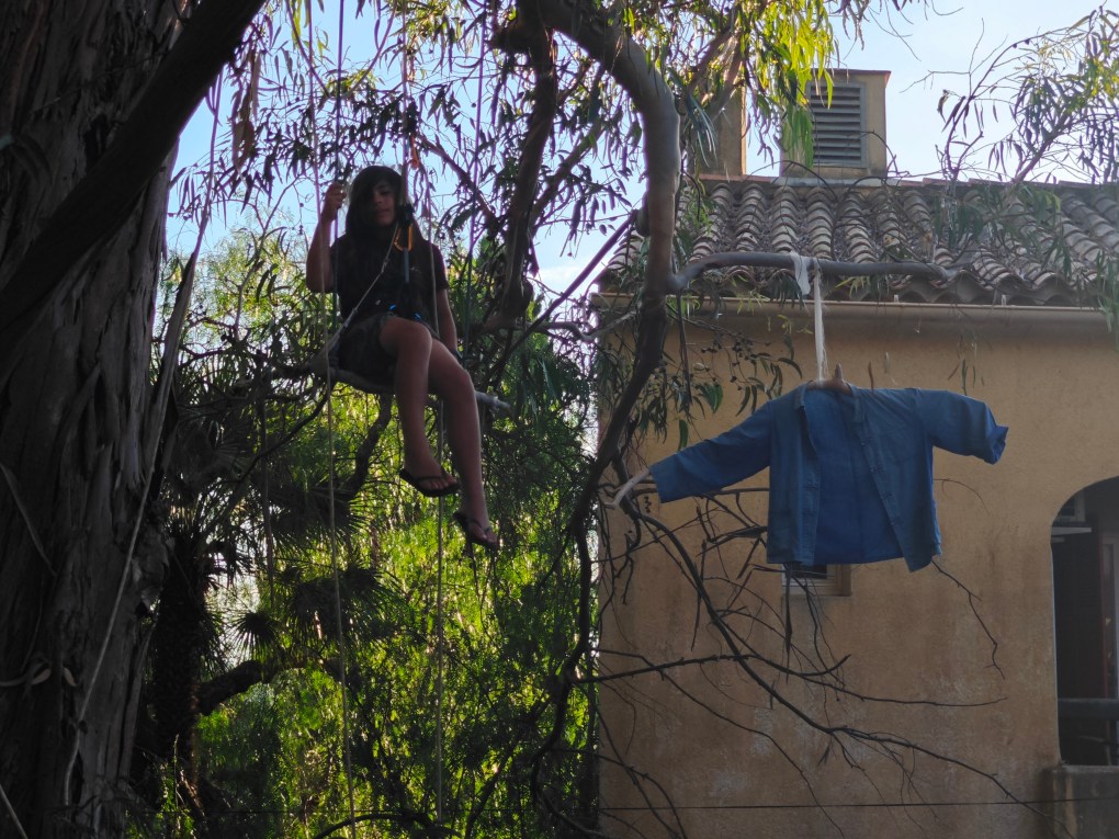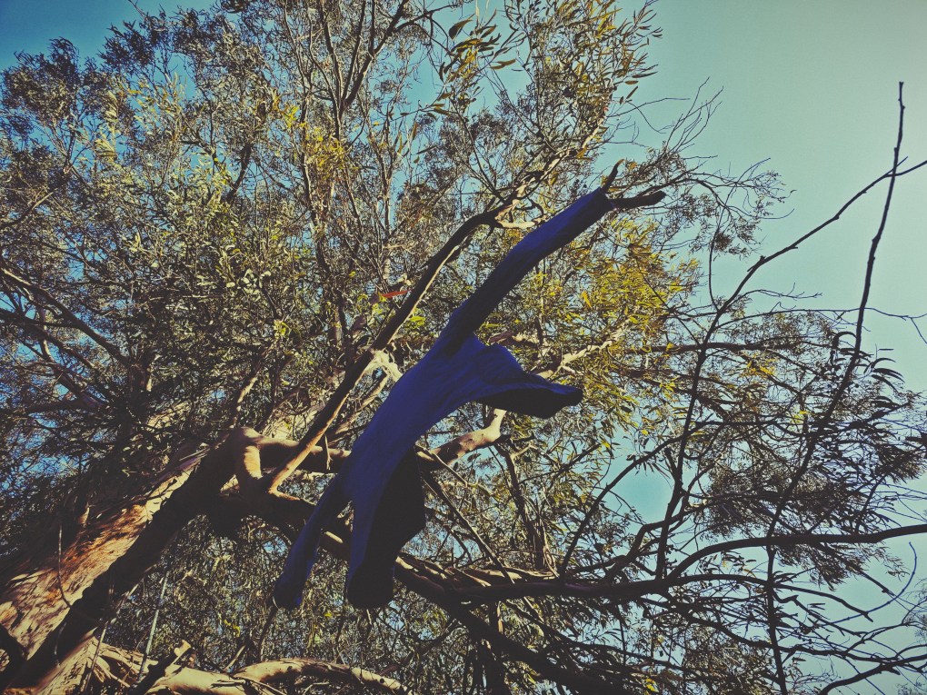 Perchement 2 • Le Chant de l’Arbre s’est transformé en un chant momentané sur les bords du Mississippi. 10 ans plus tard, je reviens sur les pas d’une offrande faite au pied de l’eucalyptus grandiose de Porquerolles, là, juste au-dessus, vers la droite de l’église Sainte-Anne. Je reviens avec de nouvelles offrandes et nos corps perchés, reliés aux branches par des cordes, nous, suspendus en contre jour, la scène, l’offrande, la joie ont lieu au cours du Festival de Jazz à Porquerolles, la première édition sans son créateur, FC, mon père, décédé dans l’année. La lumière traversera nos chevelures, nos sourires traverseront l’air. Les simples affaires de mon père au bout de filins d’or, sa chemise bleue, la pochette de l’un de ses documentaires, celui sur Archie Shepp, un parbat. Au sol, étiré, un voile blanc, son chapeau, nos objets persos, une couronne de fleurs, mon carnet dessiné, les herbes folles, Mattéo déambule en bas. Je me sens faire partie du temps, je me sens des ailes, mon corps qui me fait mal se relâche et m’emporte dans un élan renouvelé, plein. C est là. Je verrai à nouveau le sourire de JaneB sur les images de c, je verrai la lumière qui dessinait nos contours. Je verrai la beauté de la scène. Les enfants pour équilibrer l’arbre, patients, nous accompagnent entre les branches par leur propre plénitude. Remerciements aux humains de Jazz à Porquerolles, aux habitants de l’île, à l’arbre, à JaneB, Gaby Moire, aux enfants libres, à Mattéo Vergnes, à C, à Giuseppe de Vecchi, aux sons de Sébastion P., aux ami·es en présence. Je dessine, du haut de ma branche, par l’intermédiaire d’une poupée en tissu accrochée à un élastique vert, le voile en bas aspire l’encre bleue et noire à chaque rebond de la poupée lorsque je la projette et qu’elle atteint le sol. Le dessus de nos mains est maquillé en bleu. Le deuxième soir, la couleur bleue remonte sur ma jambe.
