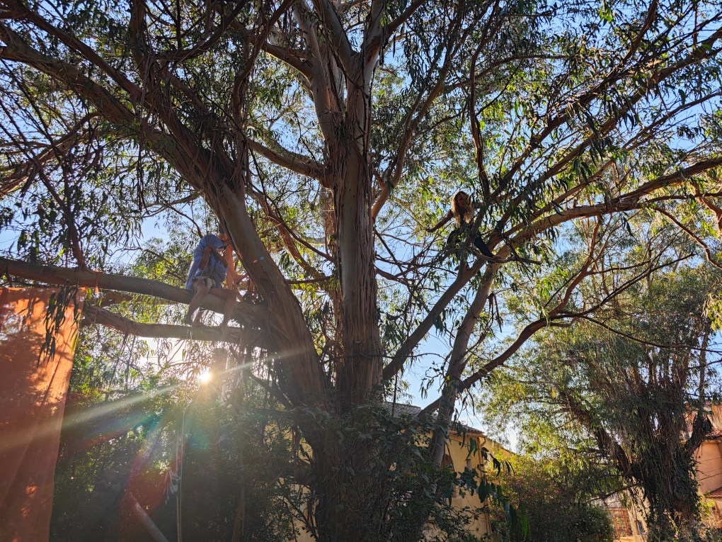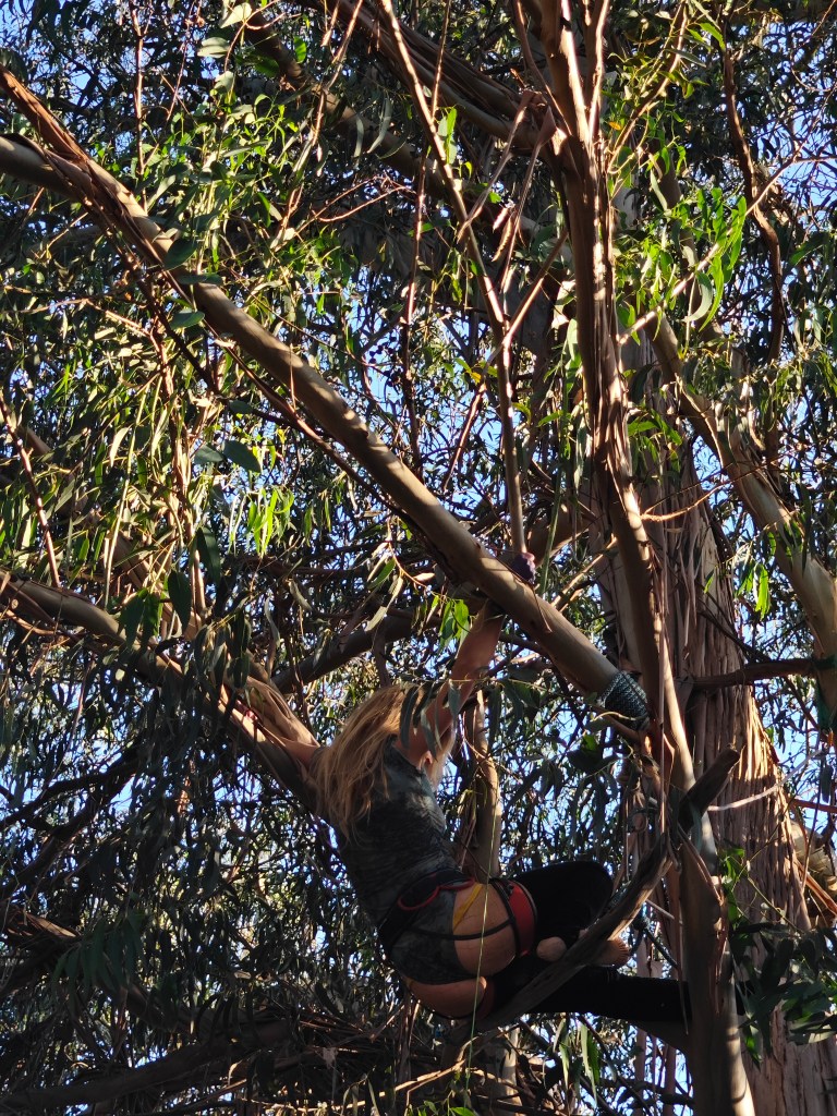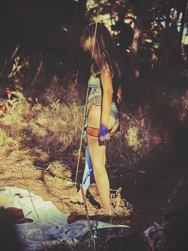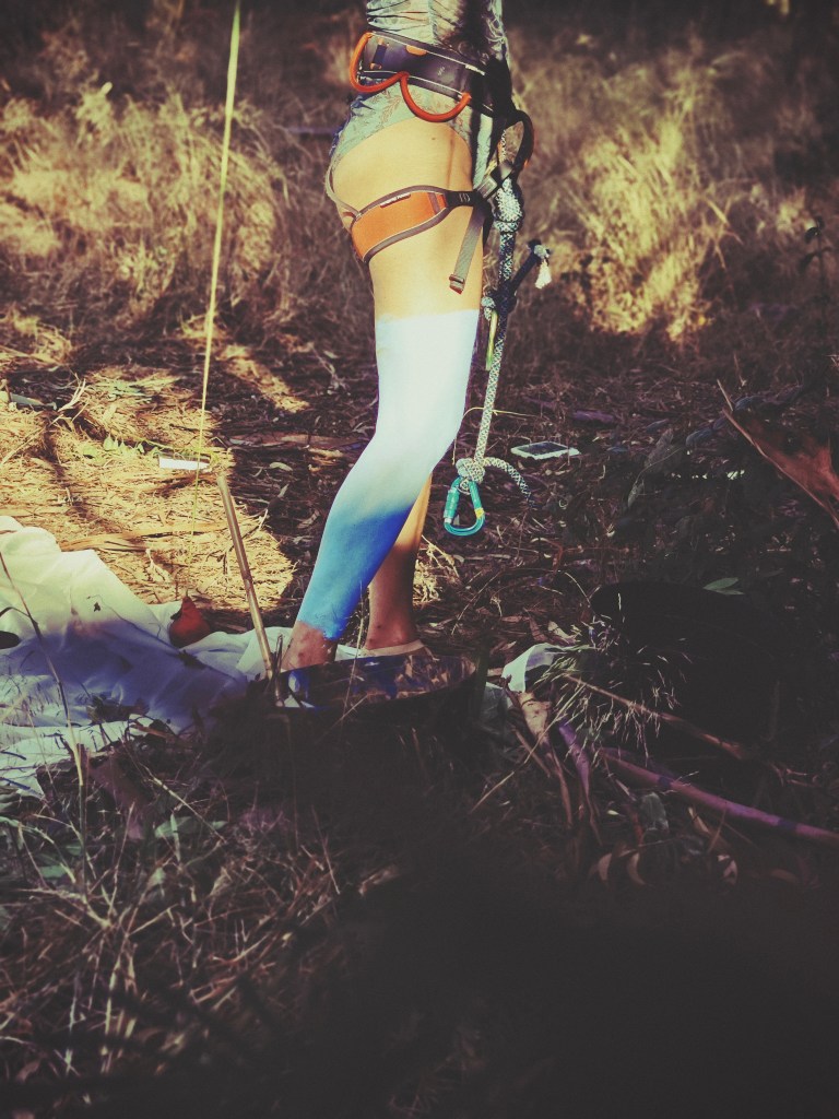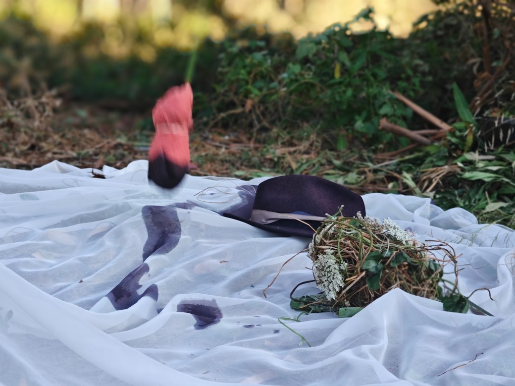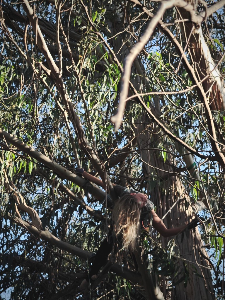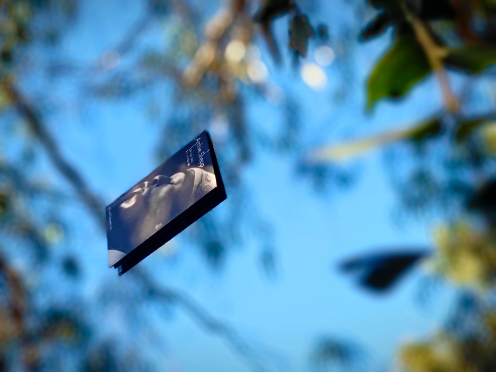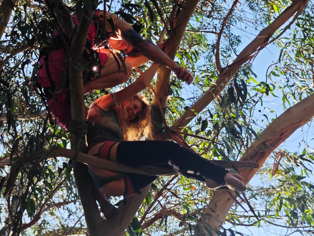 Perchement 2 • Le Chant de l’Arbre s’est transformé en un chant momentané sur les bords du Mississippi. 10 ans plus tard, je reviens sur les pas d’une offrande faite au pied de l’eucalyptus grandiose de Porquerolles, là, juste au-dessus, vers la droite de l’église Sainte-Anne. Je reviens avec de nouvelles offrandes et nos corps perchés, reliés aux branches par des cordes, nous, suspendus en contre jour, la scène, l’offrande, la joie ont lieu au cours du Festival de Jazz à Porquerolles, la première édition sans son créateur, FC, mon père, décédé dans l’année. La lumière traversera nos chevelures, nos sourires traverseront l’air. Les simples affaires de mon père au bout de filins d’or, sa chemise bleue, la pochette de l’un de ses documentaires, celui sur Archie Shepp, un parbat. Au sol, étiré, un voile blanc, son chapeau, nos objets persos, une couronne de fleurs, mon carnet dessiné, les herbes folles, Mattéo déambule en bas. Je me sens faire partie du temps, je me sens des ailes, mon corps qui me fait mal se relâche et m’emporte dans un élan renouvelé, plein. C est là. Je verrai à nouveau le sourire de JaneB sur les images de c, je verrai la lumière qui dessinait nos contours. Je verrai la beauté de la scène. Les enfants pour équilibrer l’arbre, patients, nous accompagnent entre les branches par leur propre plénitude. Remerciements aux humains de Jazz à Porquerolles, aux habitants de l’île, à l’arbre, à JaneB, Gaby Moire, aux enfants libres, à Mattéo Vergnes, à C, à Giuseppe de Vecchi, aux sons de Sébastion P., aux ami·es en présence. Je dessine, du haut de ma branche, par l’intermédiaire d’une poupée en tissu accrochée à un élastique vert, le voile en bas aspire l’encre bleue et noire à chaque rebond de la poupée lorsque je la projette et qu’elle atteint le sol. Le dessus de nos mains est maquillé en bleu. Le deuxième soir, la couleur bleue remonte sur ma jambe.