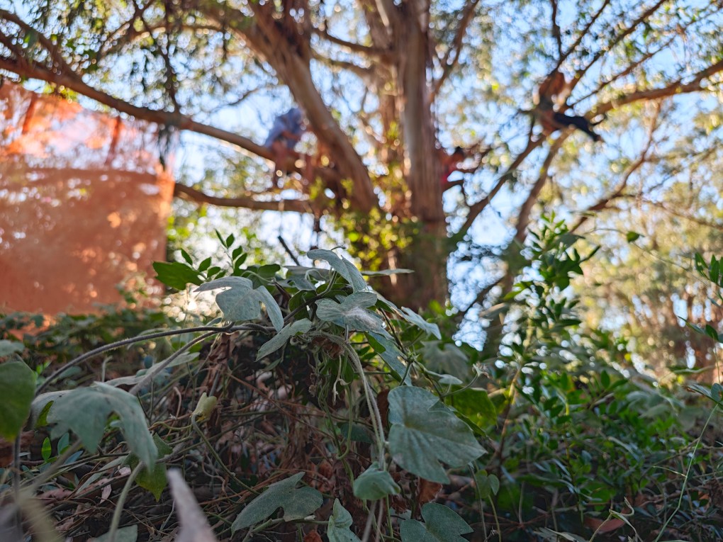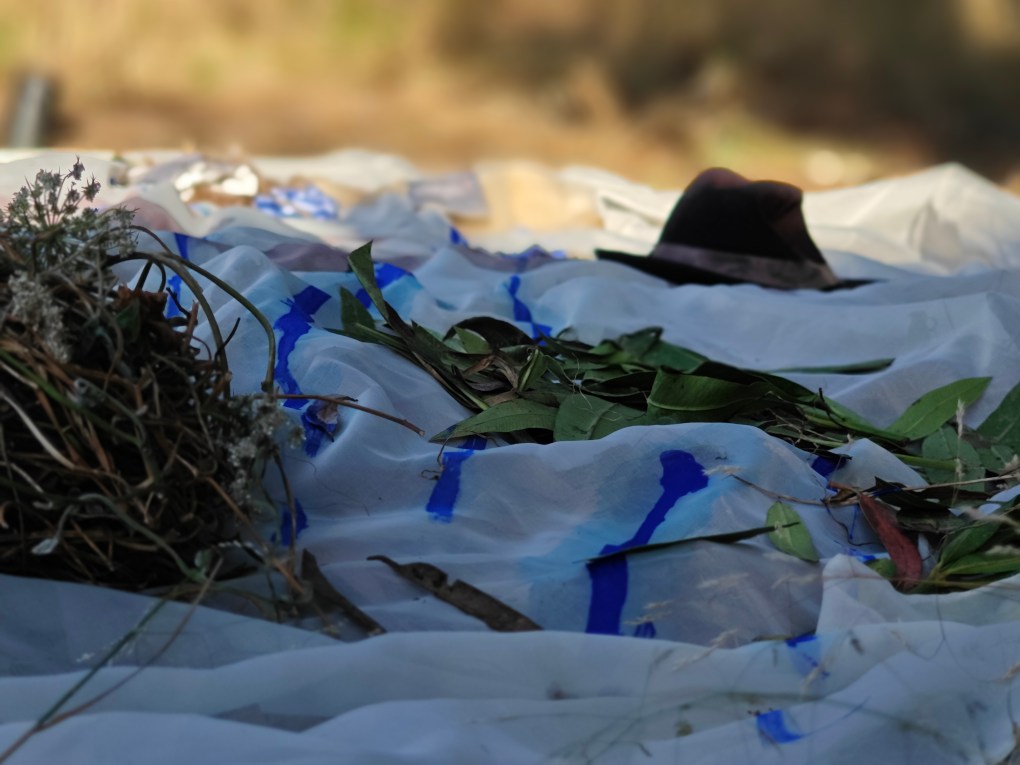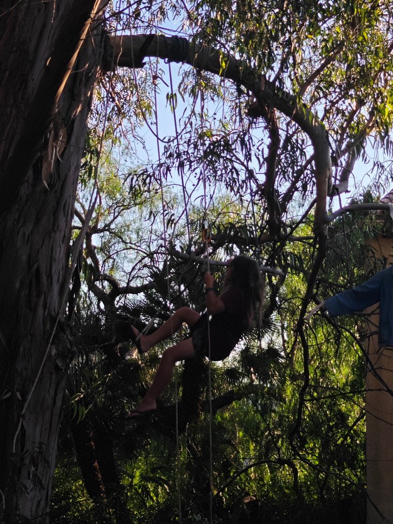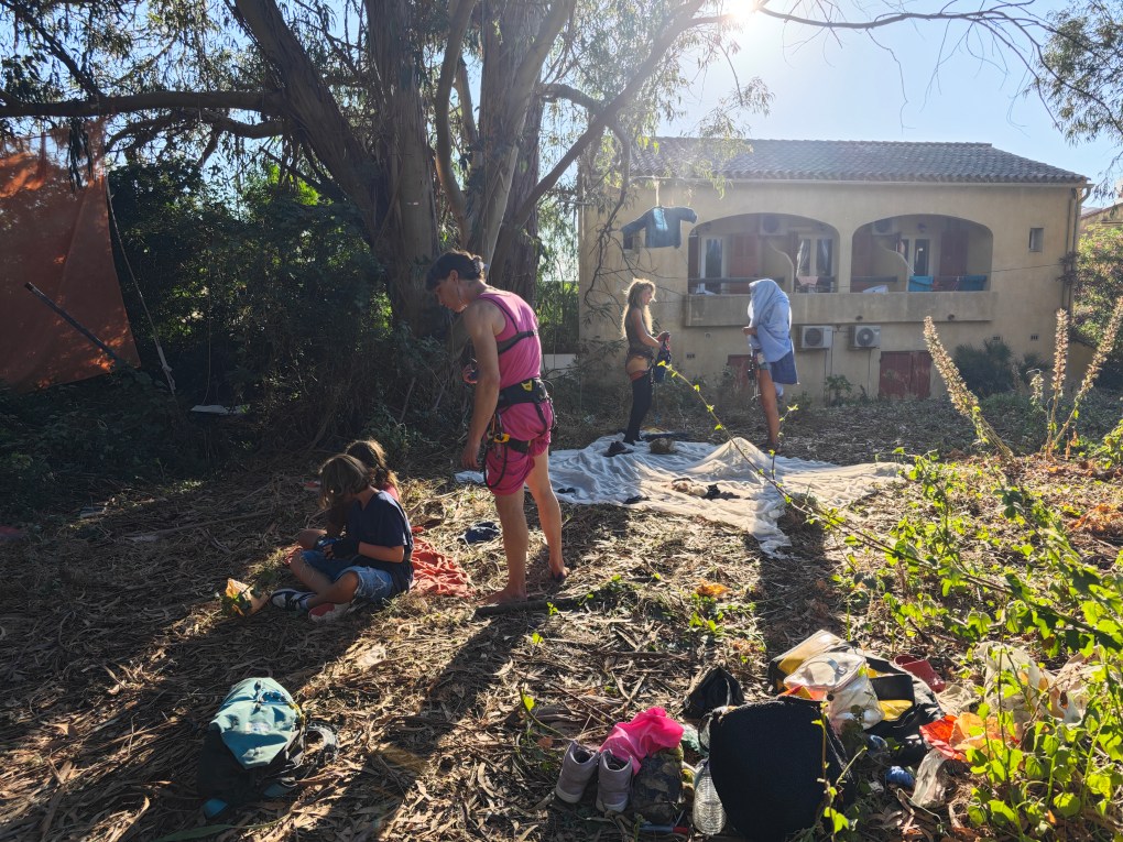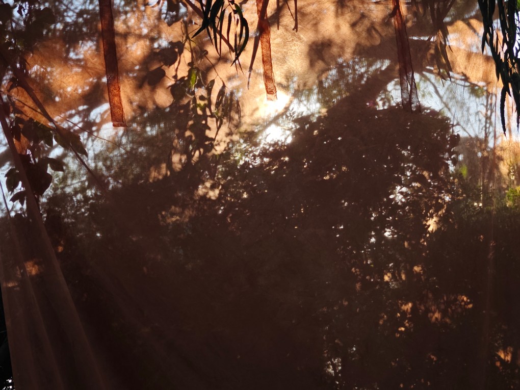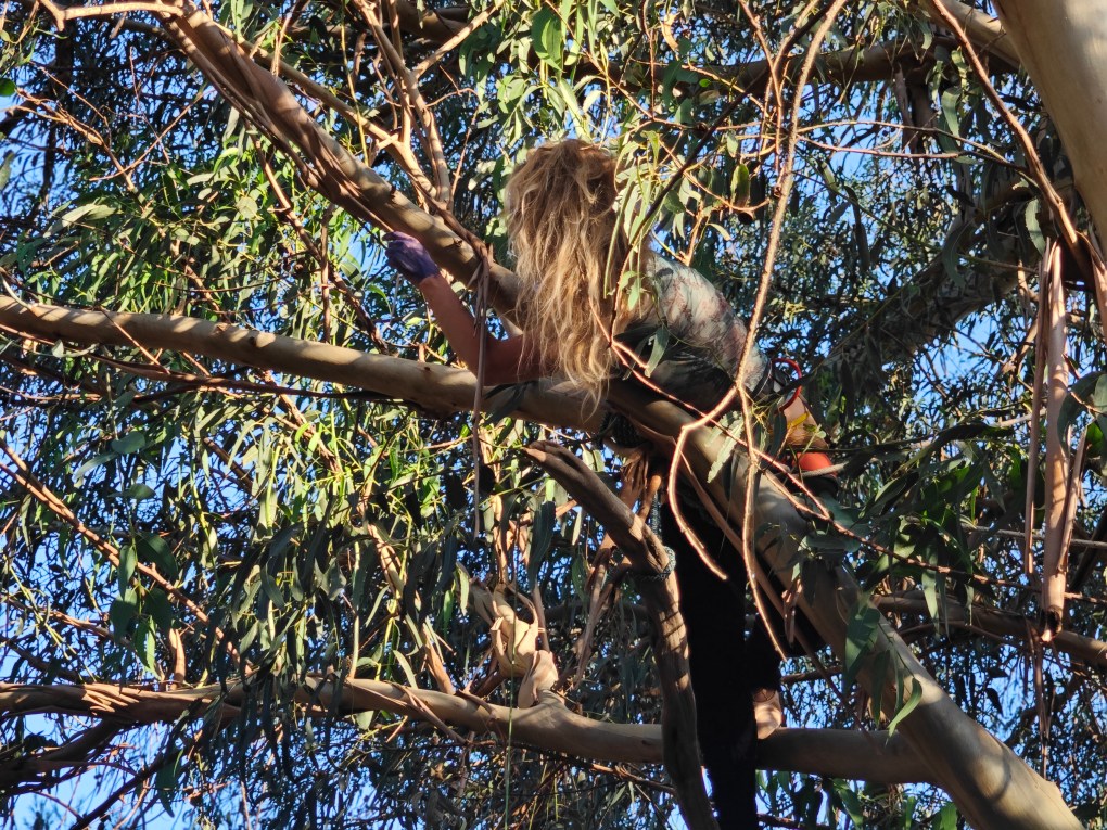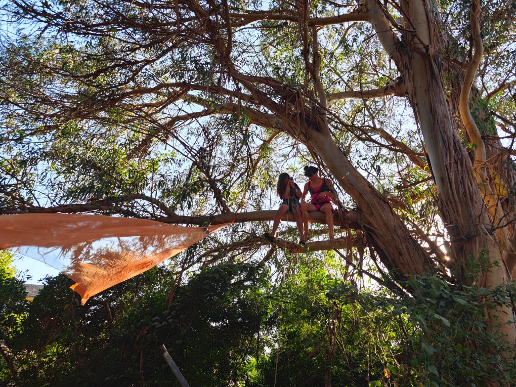 Perchement 2 • Le Chant de l’Arbre s’est transformé en un chant momentané sur les bords du Mississippi. 10 ans plus tard, je reviens sur les pas d’une offrande faite au pied de l’eucalyptus grandiose de Porquerolles, là, juste au-dessus, vers la droite de l’église Sainte-Anne. Je reviens avec de nouvelles offrandes et nos corps perchés, reliés aux branches par des cordes, nous, suspendus en contre jour, la scène, l’offrande, la joie ont lieu au cours du Festival de Jazz à Porquerolles, la première édition sans son créateur, FC, mon père, décédé dans l’année. La lumière traversera nos chevelures, nos sourires traverseront l’air. Les simples affaires de mon père au bout de filins d’or, sa chemise bleue, la pochette de l’un de ses documentaires, celui sur Archie Shepp, un parbat. Au sol, étiré, un voile blanc, son chapeau, nos objets persos, une couronne de fleurs, mon carnet dessiné, les herbes folles, Mattéo déambule en bas. Je me sens faire partie du temps, je me sens des ailes, mon corps qui me fait mal se relâche et m’emporte dans un élan renouvelé, plein. C est là. Je verrai à nouveau le sourire de JaneB sur les images de c, je verrai la lumière qui dessinait nos contours. Je verrai la beauté de la scène. Les enfants pour équilibrer l’arbre, patients, nous accompagnent entre les branches par leur propre plénitude. Remerciements aux humains de Jazz à Porquerolles, aux habitants de l’île, à l’arbre, à JaneB, Gaby Moire, aux enfants libres, à Mattéo Vergnes, à C, à Giuseppe de Vecchi, aux sons de Sébastion P., aux ami·es en présence. Je dessine, du haut de ma branche, par l’intermédiaire d’une poupée en tissu accrochée à un élastique vert, le voile en bas aspire l’encre bleue et noire à chaque rebond de la poupée lorsque je la projette et qu’elle atteint le sol. Le dessus de nos mains est maquillé en bleu. Le deuxième soir, la couleur bleue remonte sur ma jambe.