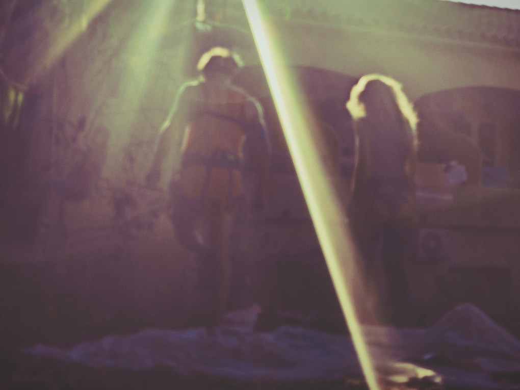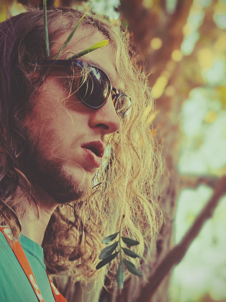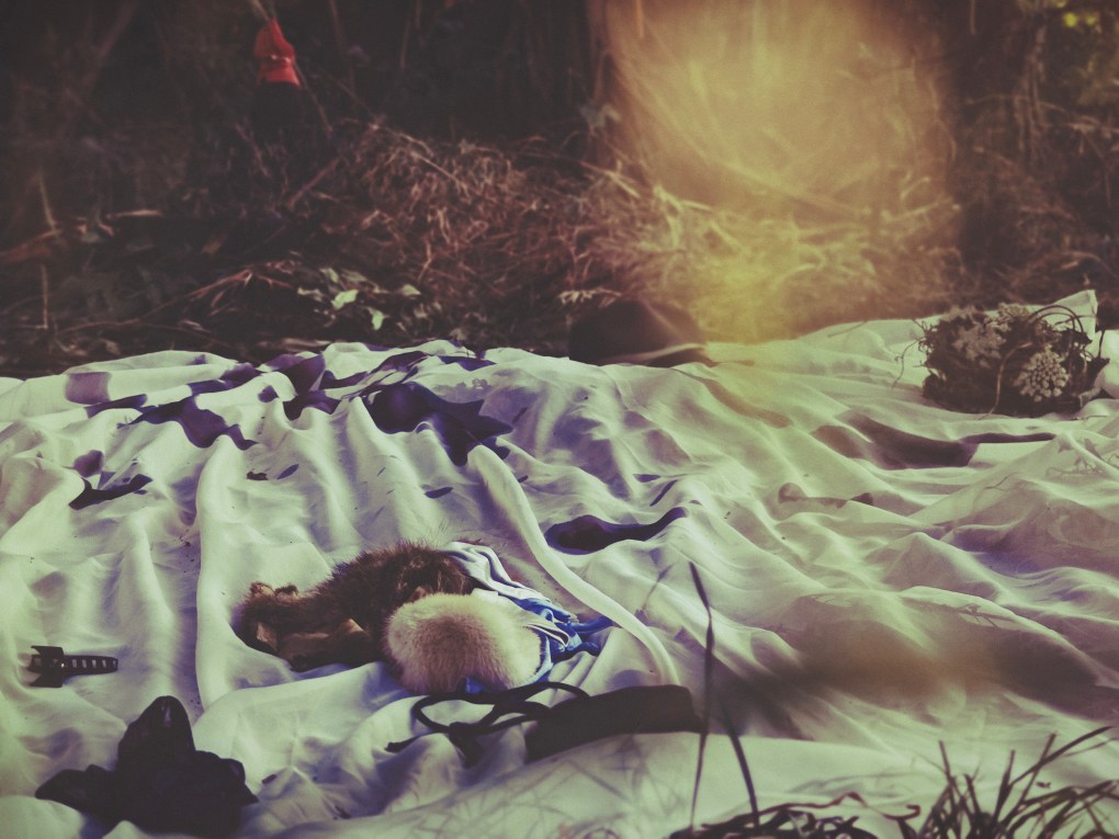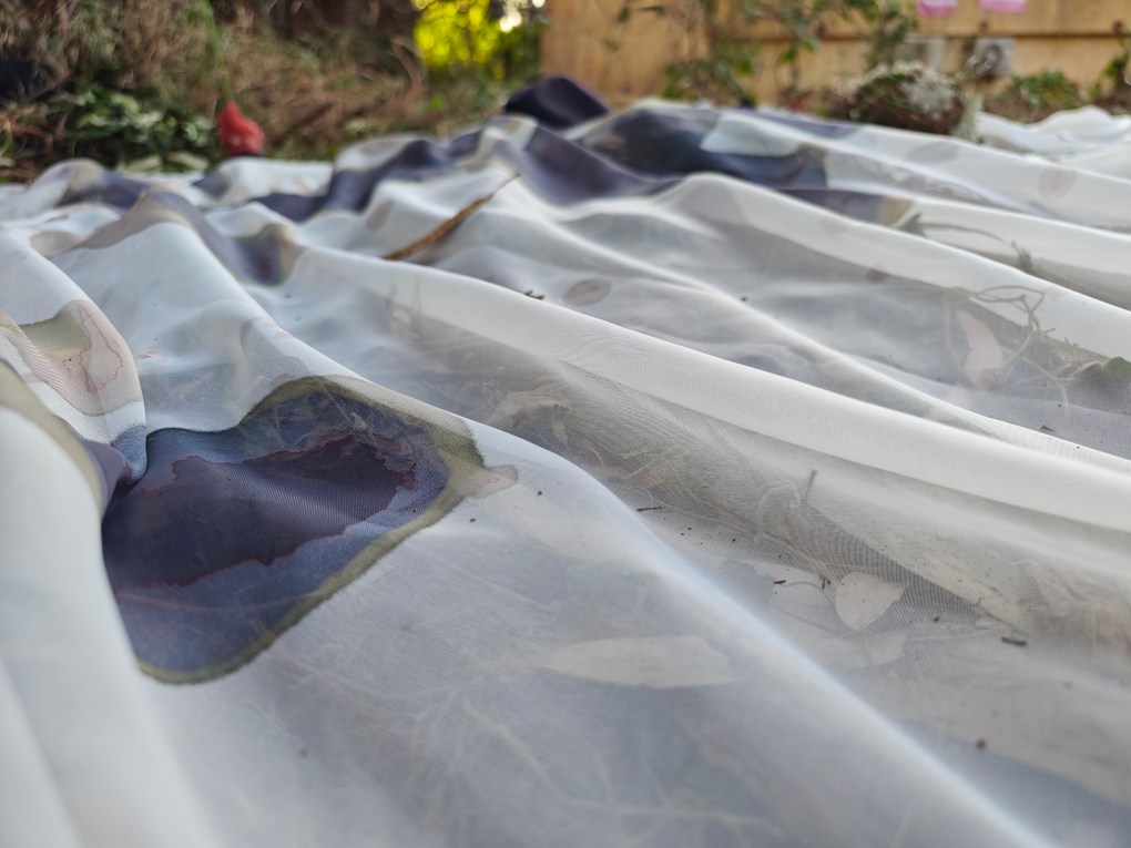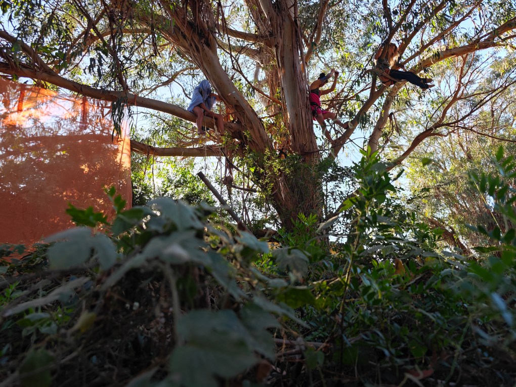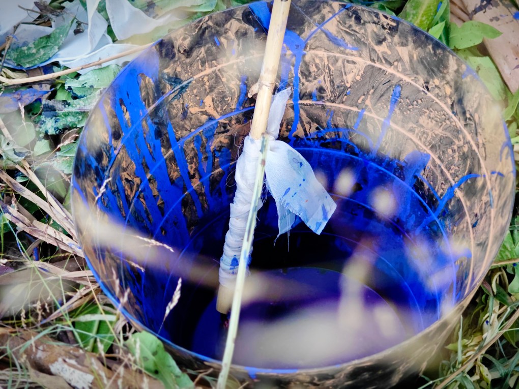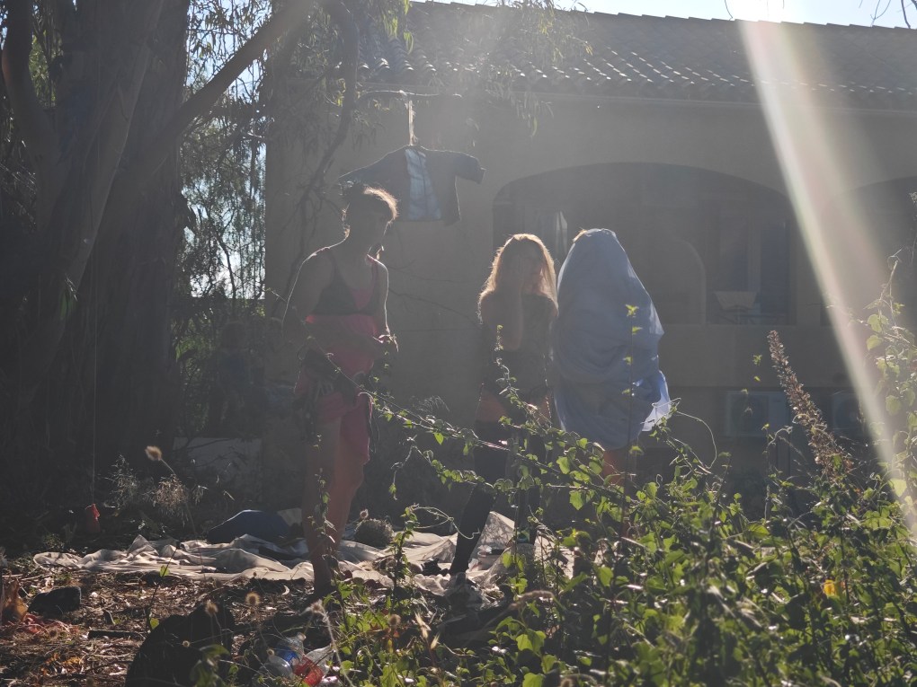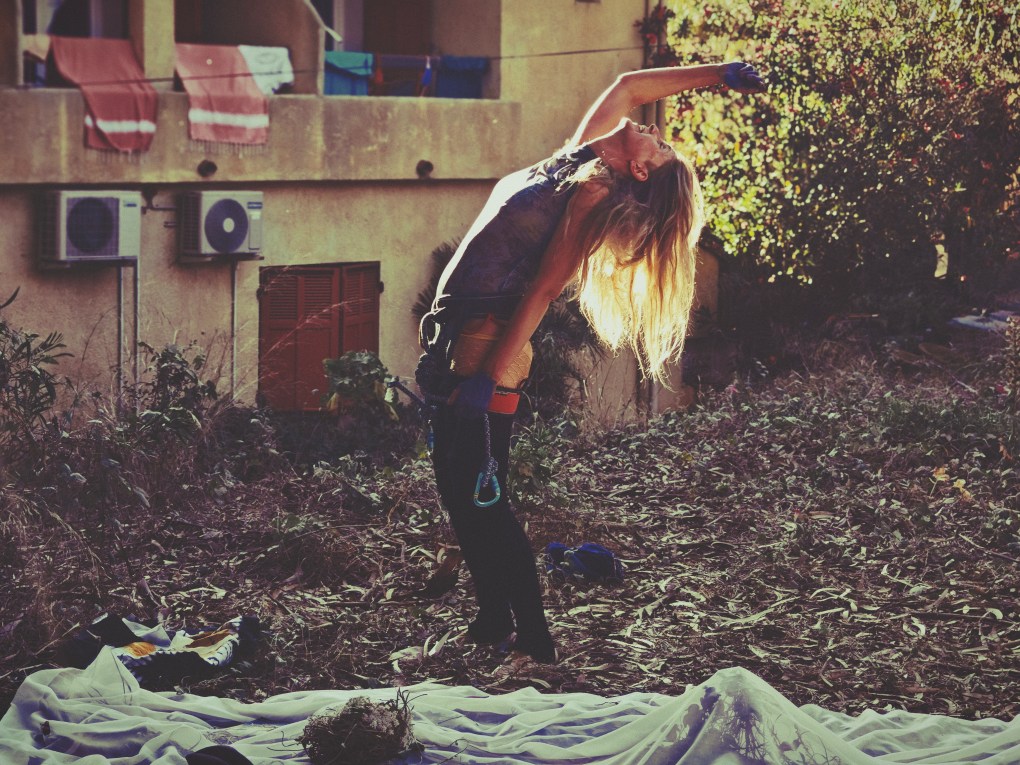 Perchement 2 • Le Chant de l’Arbre s’est transformé en un chant momentané sur les bords du Mississippi. 10 ans plus tard, je reviens sur les pas d’une offrande faite au pied de l’eucalyptus grandiose de Porquerolles, là, juste au-dessus, vers la droite de l’église Sainte-Anne. Je reviens avec de nouvelles offrandes et nos corps perchés, reliés aux branches par des cordes, nous, suspendus en contre jour, la scène, l’offrande, la joie ont lieu au cours du Festival de Jazz à Porquerolles, la première édition sans son créateur, FC, mon père, décédé dans l’année. La lumière traversera nos chevelures, nos sourires traverseront l’air. Les simples affaires de mon père au bout de filins d’or, sa chemise bleue, la pochette de l’un de ses documentaires, celui sur Archie Shepp, un parbat. Au sol, étiré, un voile blanc, son chapeau, nos objets persos, une couronne de fleurs, mon carnet dessiné, les herbes folles, Mattéo déambule en bas. Je me sens faire partie du temps, je me sens des ailes, mon corps qui me fait mal se relâche et m’emporte dans un élan renouvelé, plein. C est là. Je verrai à nouveau le sourire de JaneB sur les images de c, je verrai la lumière qui dessinait nos contours. Je verrai la beauté de la scène. Les enfants pour équilibrer l’arbre, patients, nous accompagnent entre les branches par leur propre plénitude. Remerciements aux humains de Jazz à Porquerolles, aux habitants de l’île, à l’arbre, à JaneB, Gaby Moire, aux enfants libres, à Mattéo Vergnes, à C, à Giuseppe de Vecchi, aux sons de Sébastion P., aux ami·es en présence. Je dessine, du haut de ma branche, par l’intermédiaire d’une poupée en tissu accrochée à un élastique vert, le voile en bas aspire l’encre bleue et noire à chaque rebond de la poupée lorsque je la projette et qu’elle atteint le sol. Le dessus de nos mains est maquillé en bleu. Le deuxième soir, la couleur bleue remonte sur ma jambe.