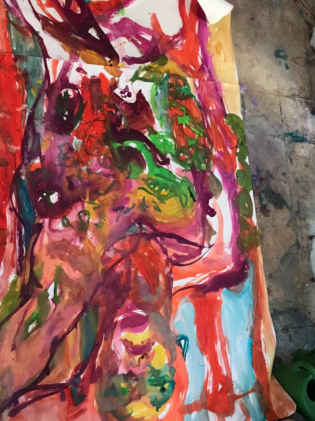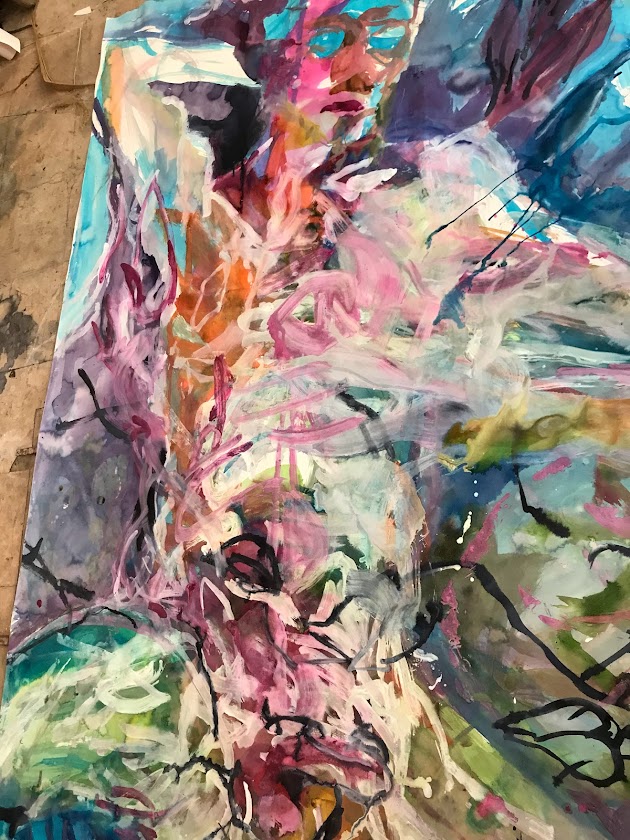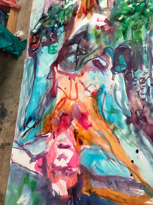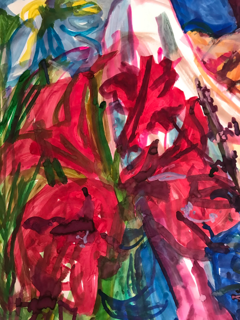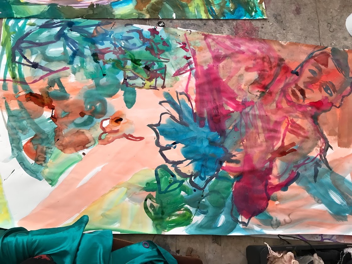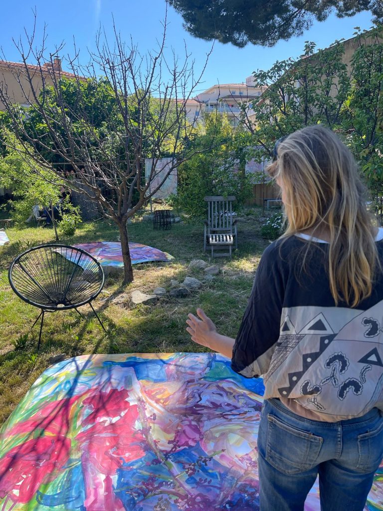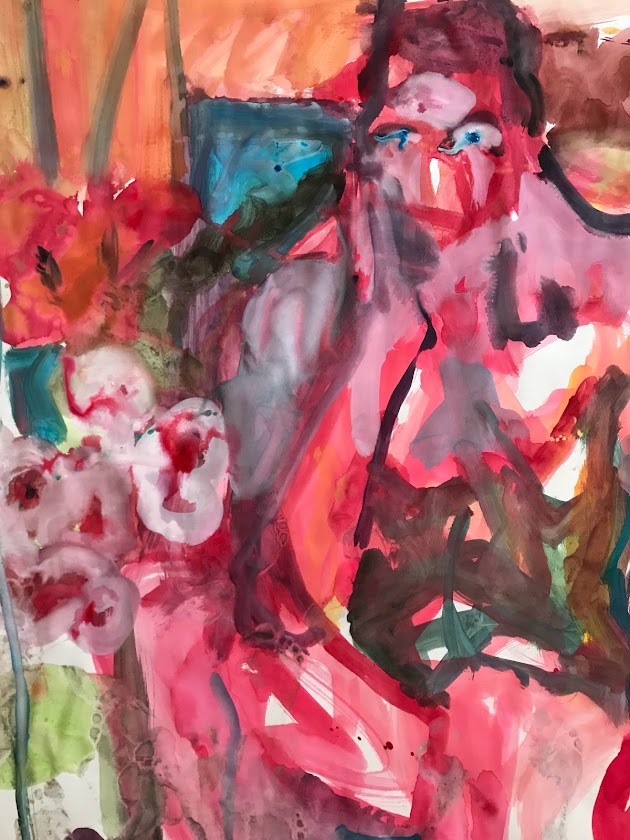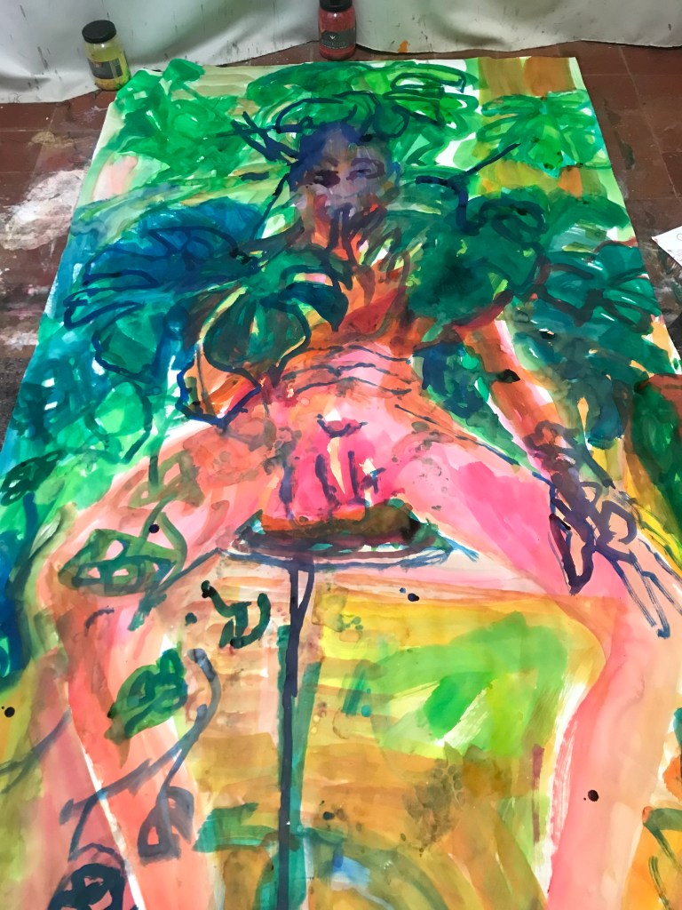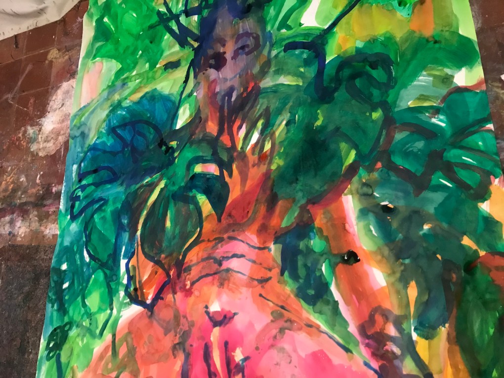 Sur une période intense de 6 mois en 2021-22, peintures géantes du modèle M. aux fleurs via zoom par Sarah Cassenti . Encres, pigments. Format 180cm x350cm, variable . Certaines peintures seront exposées en mai 2025 dans le jardin de Laurence Castermans .