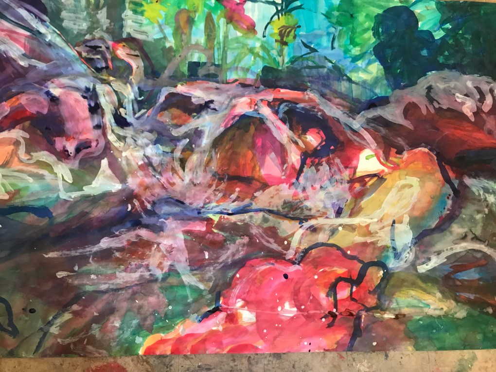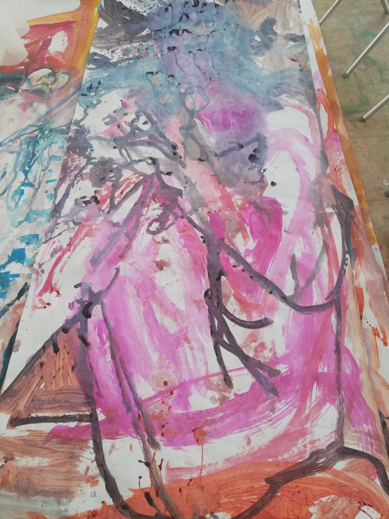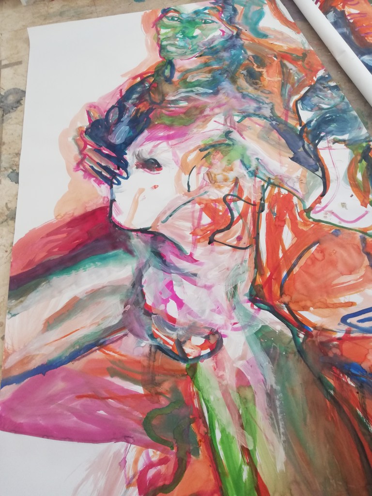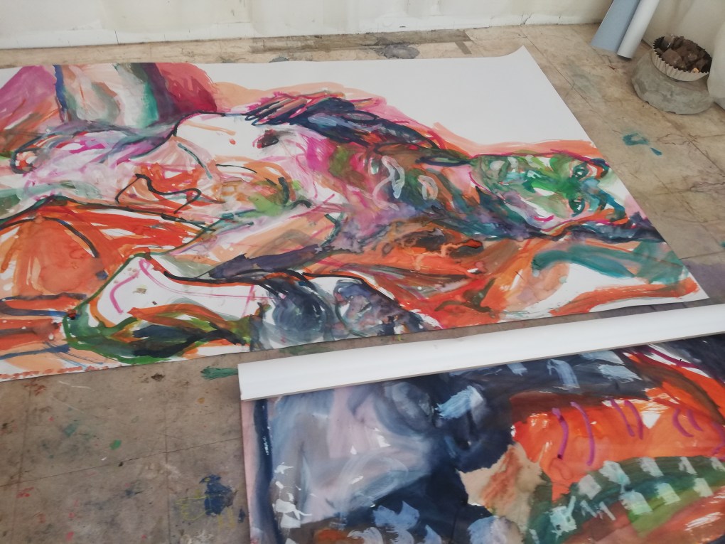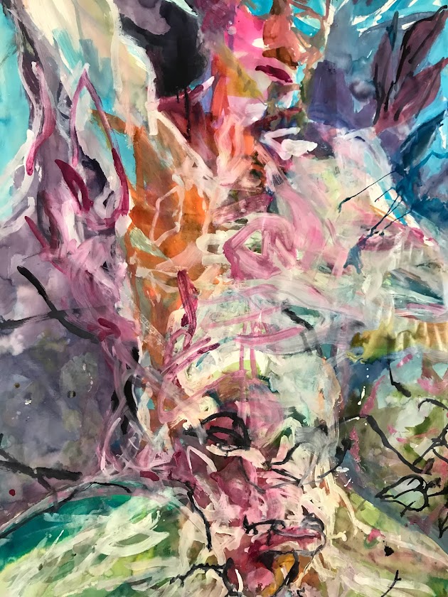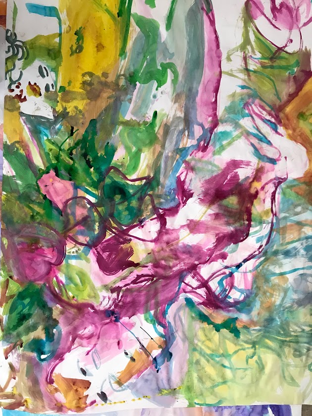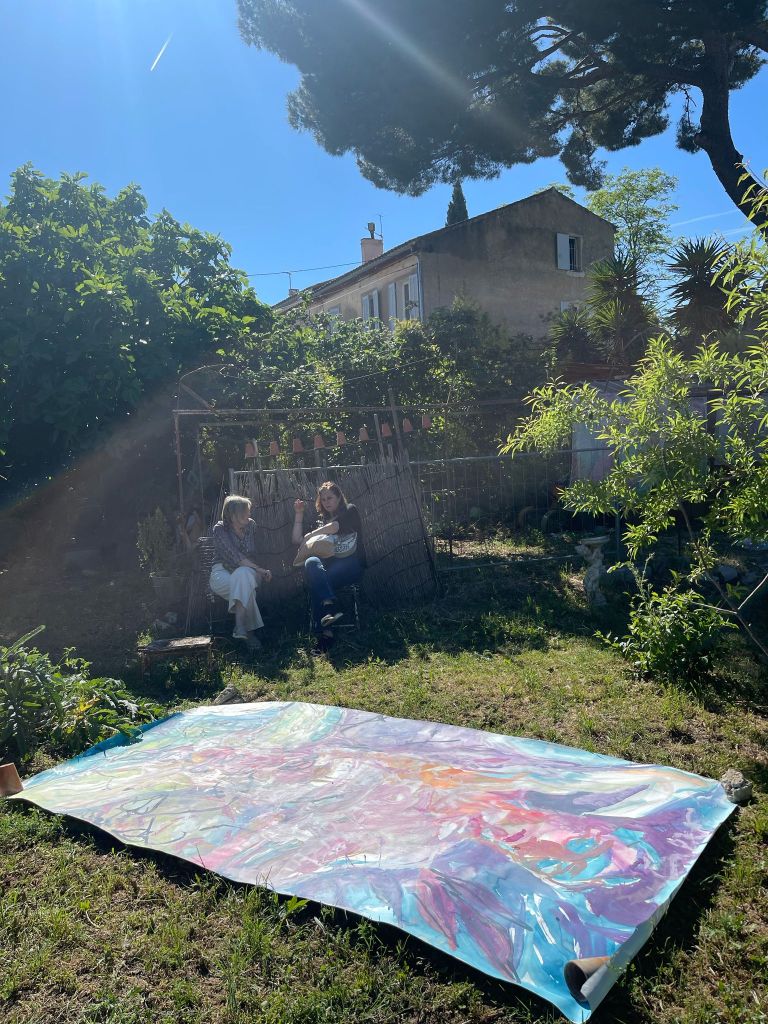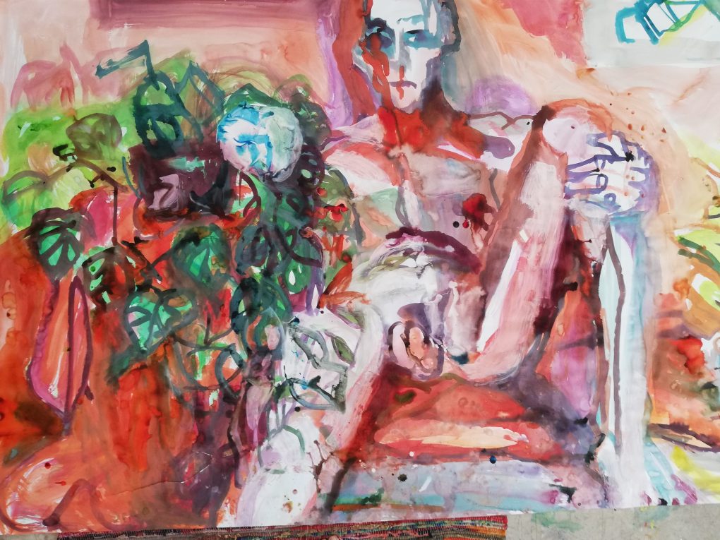 Sur une période intense de 6 mois en 2021-22, peintures géantes du modèle M. aux fleurs via zoom par Sarah Cassenti . Encres, pigments. Format 180cm x350cm, variable . Certaines peintures seront exposées en mai 2025 dans le jardin de Laurence Castermans .