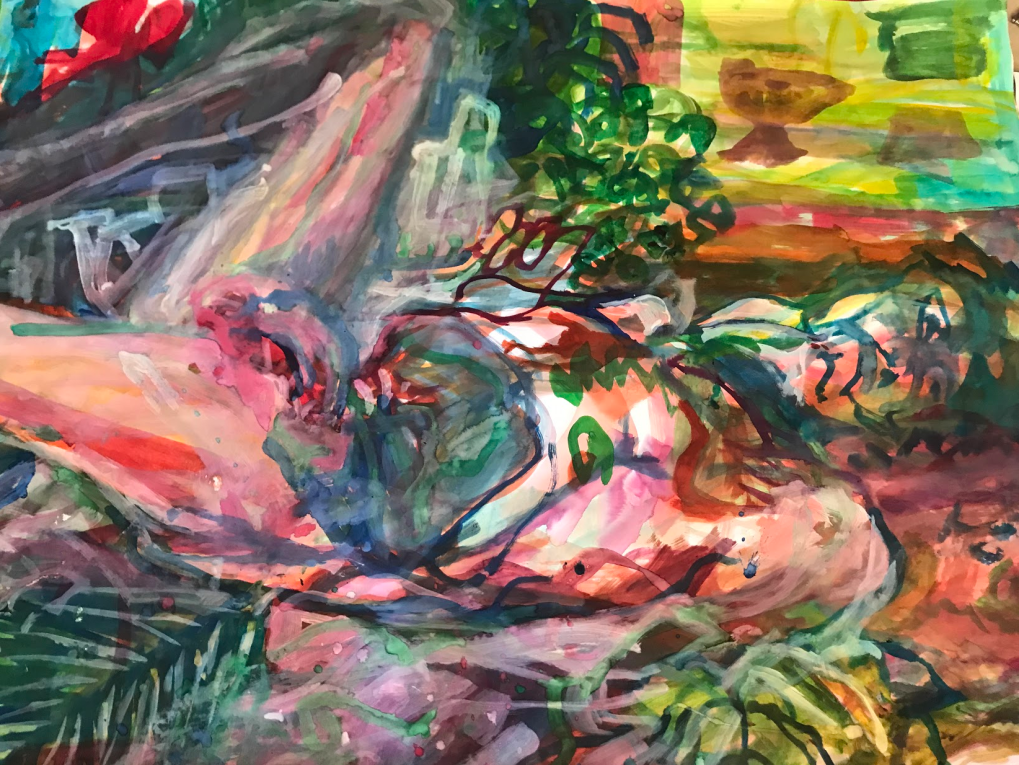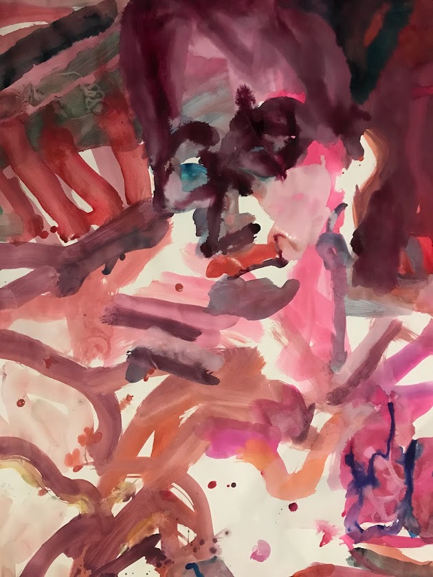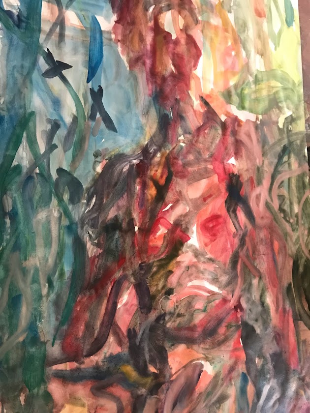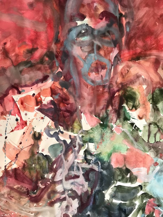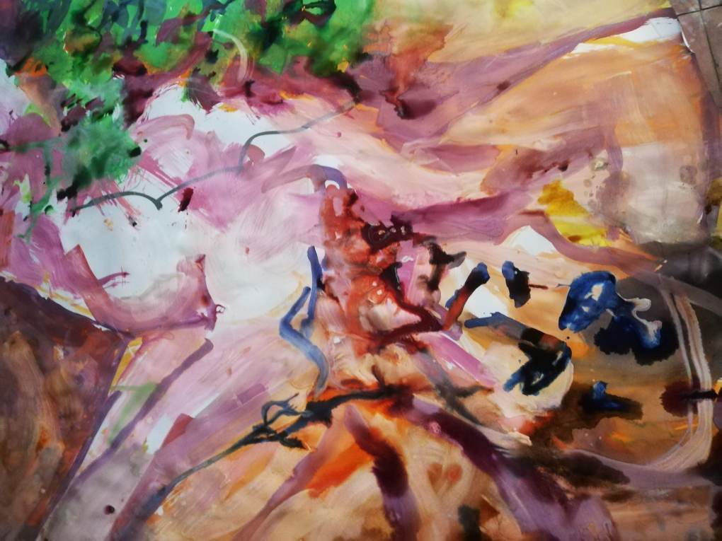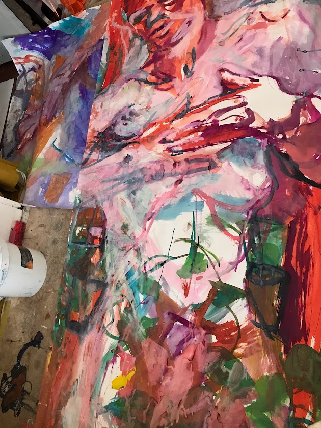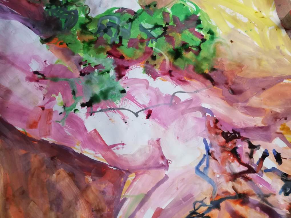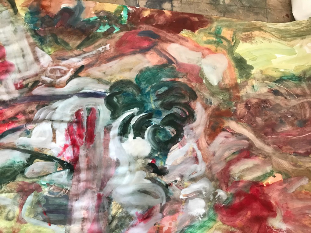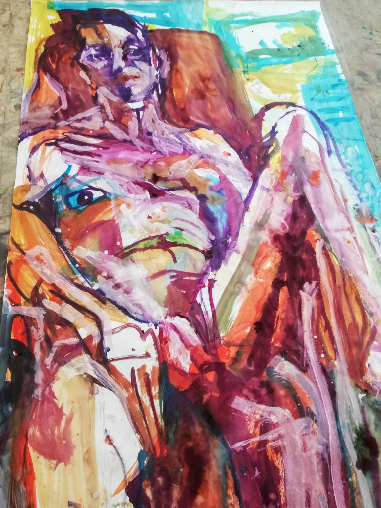 Sur une période intense de 6 mois en 2021-22, peintures géantes du modèle M. aux fleurs via zoom par Sarah Cassenti . Encres, pigments. Format 180cm x350cm, variable . Certaines peintures seront exposées en mai 2025 dans le jardin de Laurence Castermans .