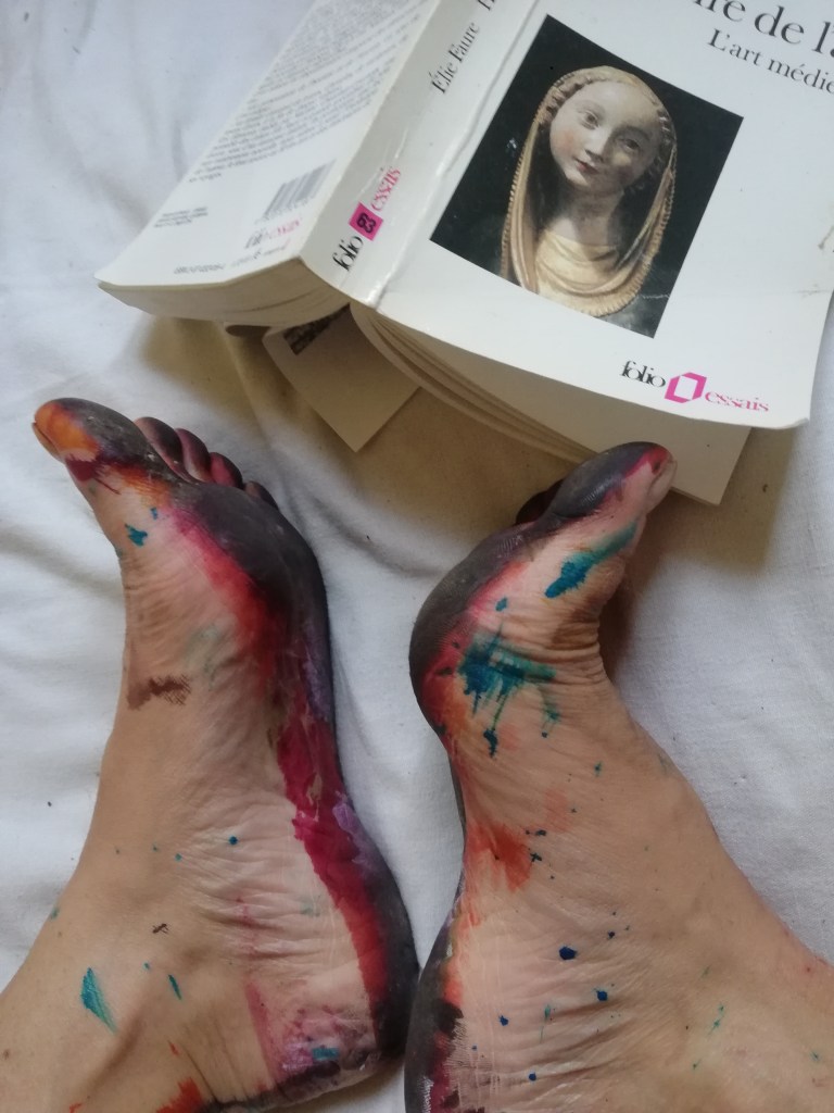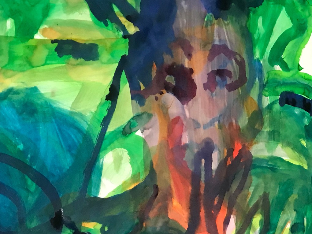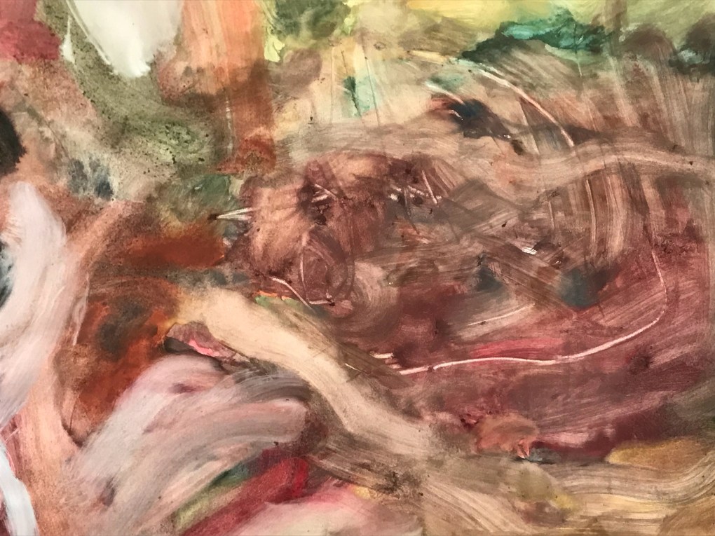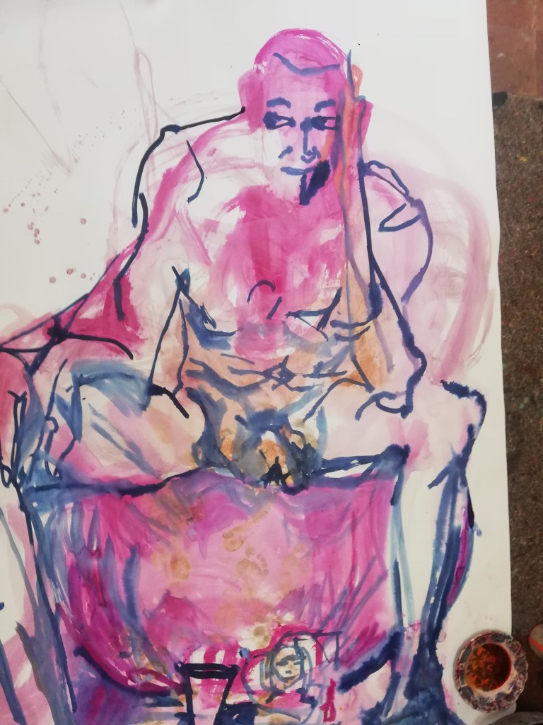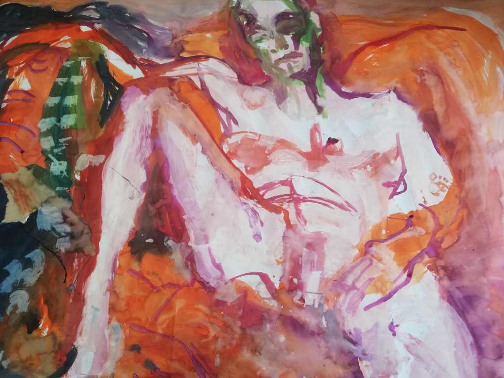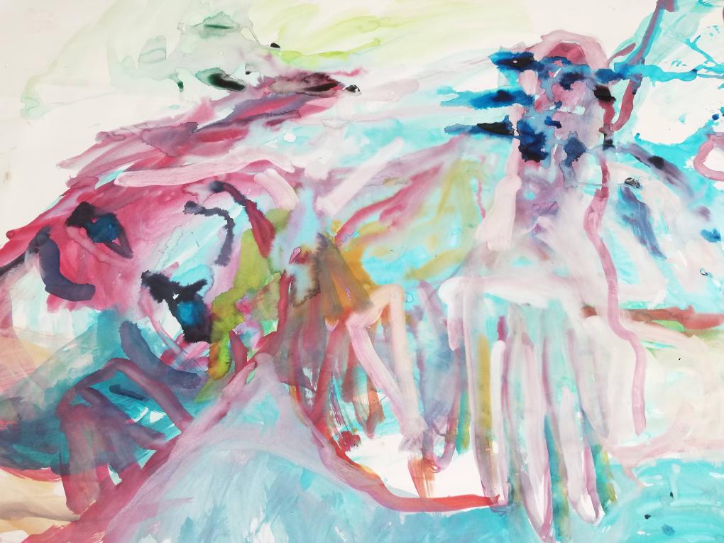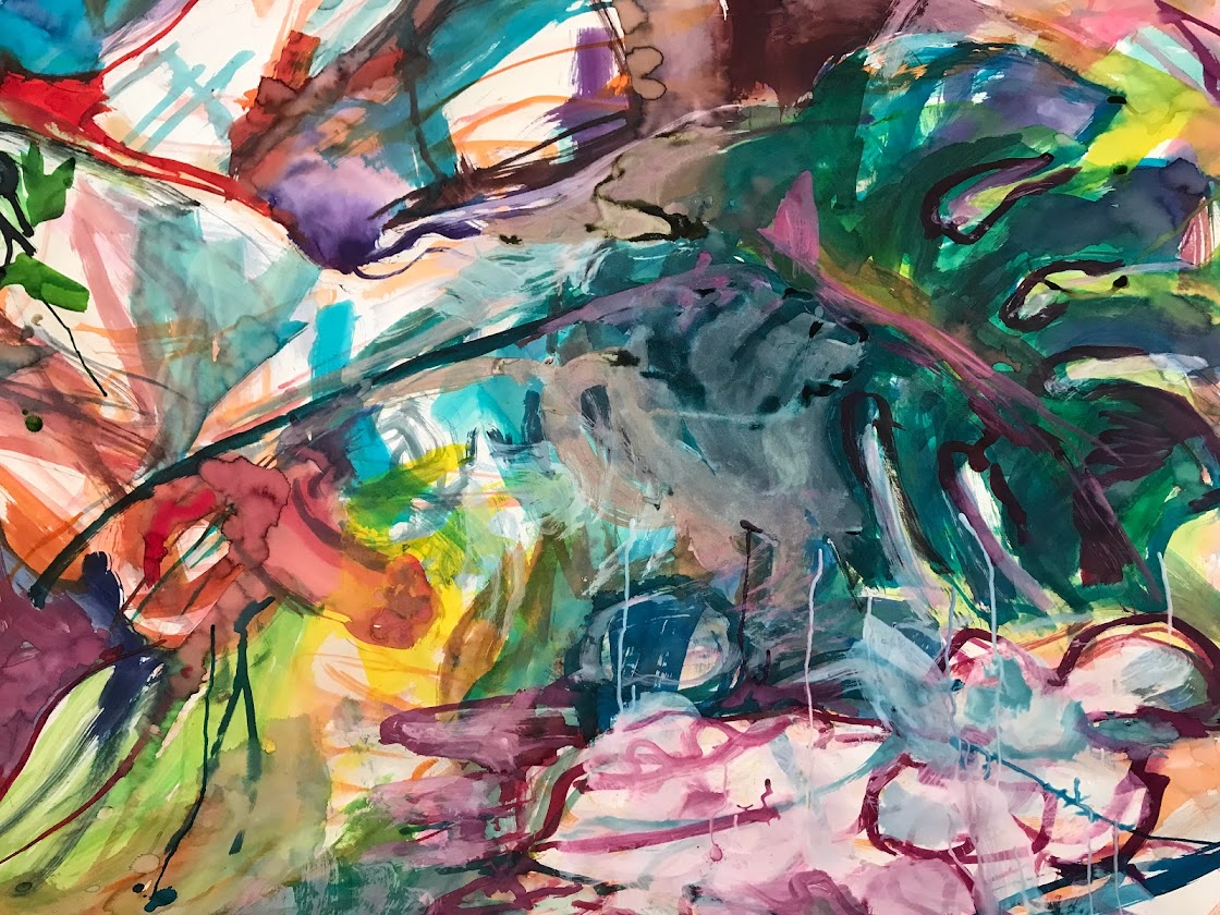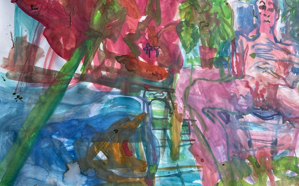 Sur une période intense de 6 mois en 2021-22, peintures géantes du modèle M. aux fleurs via zoom par Sarah Cassenti . Encres, pigments. Format 180cm x350cm, variable . Certaines peintures seront exposées en mai 2025 dans le jardin de Laurence Castermans .